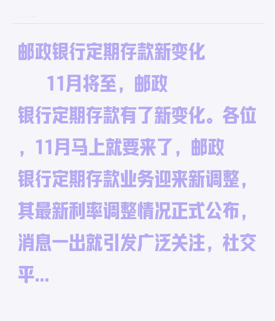 邮政银行定期存款新变化 11月将至,邮政银行定期存款有了新变化。各位,11月马上就要来了,邮政银行定期存款业务迎来新调整,其最新利率调整情况正式公布,消息一出就引发广泛关注,社交平台上讨论不断。不少人都在想,自己辛苦攒下的3万元存进邮政银行,一年能拿多少利息?我在银行工作30多年了,今天就给大家算算这笔账。 老百姓把钱存银行,图的就是个安稳,还能赚点利息补贴家用。银行利率就像经济的晴雨表,稍有变动,利息就会跟着变。这次邮政银行利率调整登上热搜,大家最关心的就是3万元存一年到底有多少利息。刷到视频的朋友可得留意了,接下来讲讲存款时怎样多赚利息,错过可就亏咯。 邮政银行作为国有大行,一举一动都备受关注,此次利率调整更是焦点中的焦点。大家肯定好奇,为啥这次变动这么大?是市场环境变了,还是银行有了新规划?目前先别瞎猜,但对普通人来说,这影响可不小。看到视频的朋友,对这次利率调整有啥看法?有想法的欢迎后续交流。关注银行利率是很明智的,这关系到咱们的钱包和未来的理财规划。 重点来了,看看邮政银行最新的利率调整到底是怎样的。需要提醒的是,银行利率可能因地区、网点不同而有差异,具体以当地网点最新公告为准。根据邮政银行最新消息,一年期定期存款挂牌利率现在是1.98%,3万元存一年利息就是3万×1.98% = 294元。不过这只是基础算法,实际收益还会受存款期限、方式等因素影响。比如除了普通定期存款,还有大额存单等产品,但要注意,邮政银行一年期大额存单通常起存金额是20万,3万元达不到条件,无法享受相应利率。 另外,除了利率,大家还要关注银行其他存款政策和变化,有些网点可能会根据当地市场和揽储需求,上调定期存款利率。同时,存款不能只看利率和利息,安全性和灵活性也很重要,提前支取可能会损失不少利息。大家觉得这些信息有用吗?要是想了解更准确的利息收益,建议去当地邮政银行网点咨询,或者通过邮政银行官方客服渠道获取最新实时存款利率信息。