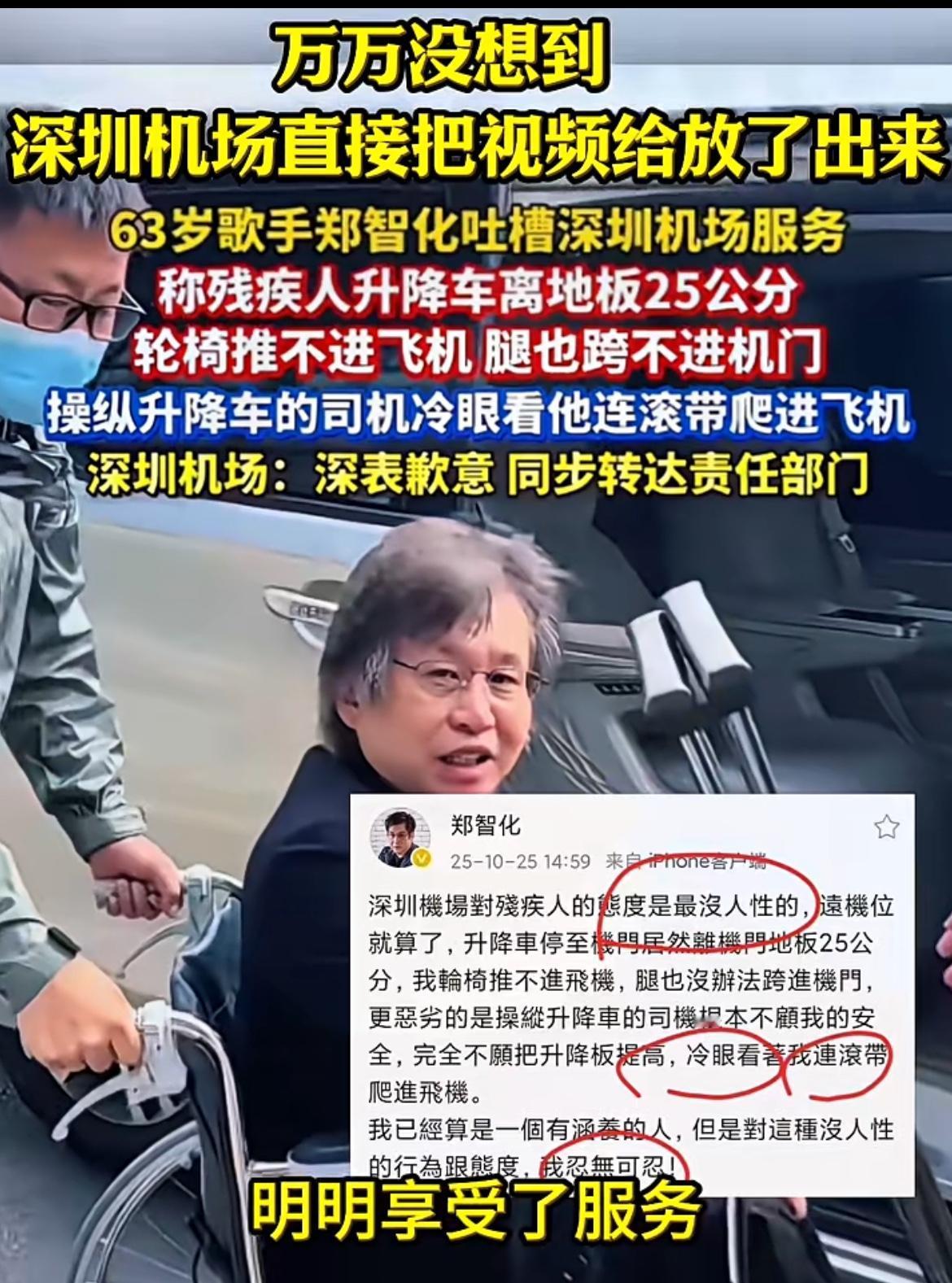 深圳机场把郑智化登机的视频发了出来! 前几天郑智化发文痛批深圳机场的对残疾人的态度是毫无人性的, 还说自己是连滚带爬的进的客舱。 但深圳机场的监控显示, 他进客舱的时候,乘务员立刻就上前对他进行搀扶, 服务态度是很好的,也是充满爱心的! 或许是因为舱门和廊桥的高度有些误差吧, 但其实人家机组人员也没有冷眼旁观吧, 郑智化的批评有点太重了吧! 从小就非常喜欢他的歌,水手、星星点灯都是我少年时代的记忆, 希望他做为偶像和公众人物,说话还是要客观一点哦… 深圳机场 郑智化 残疾人