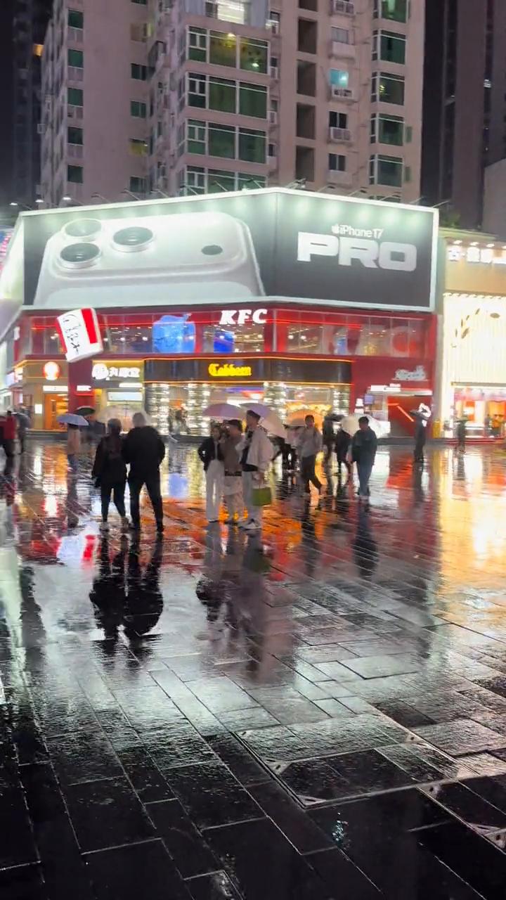 晚上快十点钟的成都春熙路给大家看一下,下着雨,有人穿羽绒服了。今天晚上甘孜州可能暴雪,明天要去毕棚沟。最近施工酿山、九寨沟特别火爆。这是十月二十六号星期天晚上快十点钟的四川成都,大家看看穿什么衣服,到川西肯定要穿羽绒服。