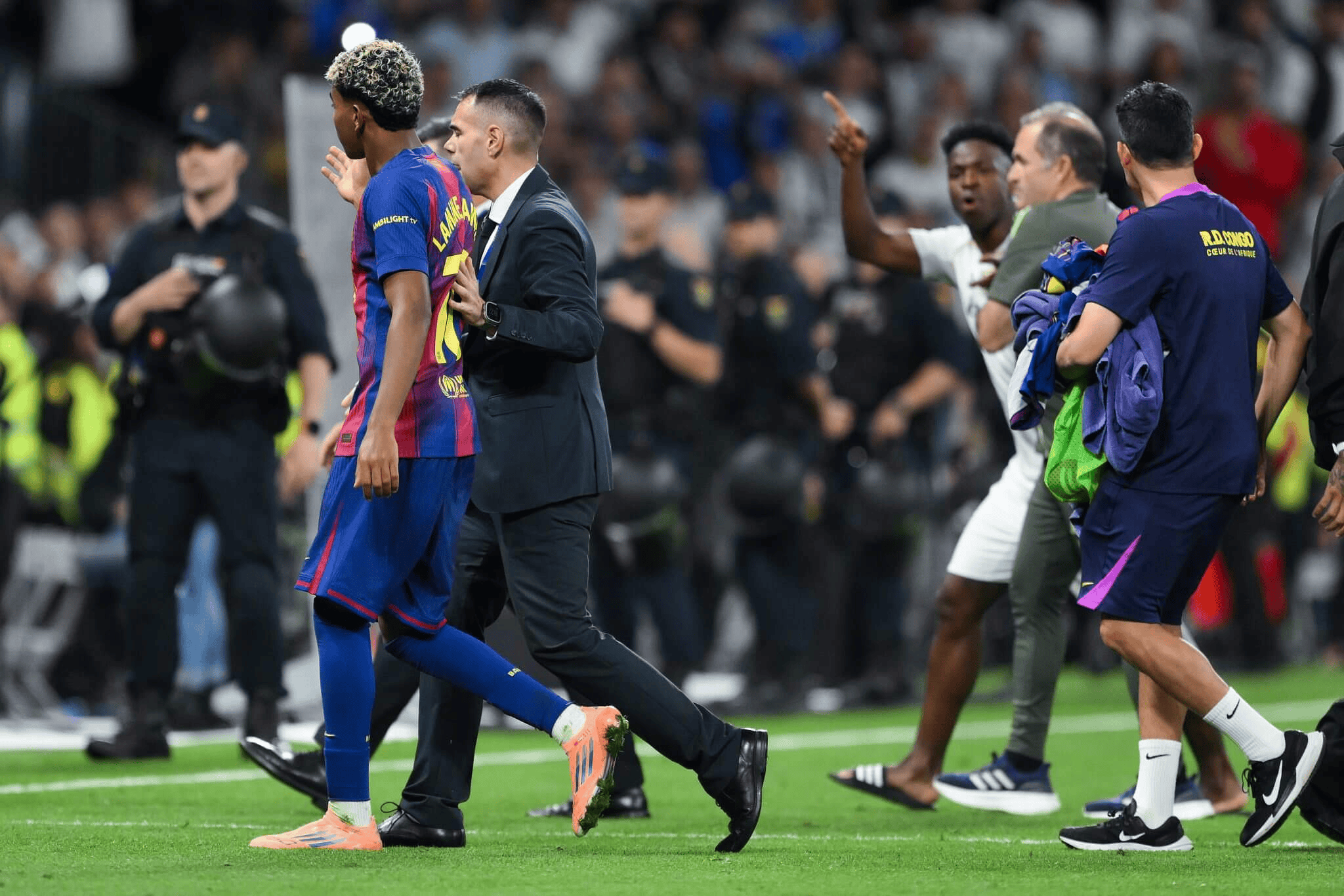 皇马门将教练路易斯-洛皮斯试图将维尼修斯拖到球员通道,但这位巴西人似乎在回应什么,开始冲向亚马尔,最终被四名皇马工作人员拦住。拉菲尼亚跑向他的国家队队友,但皇马的巴尔韦德及时阻止了他。