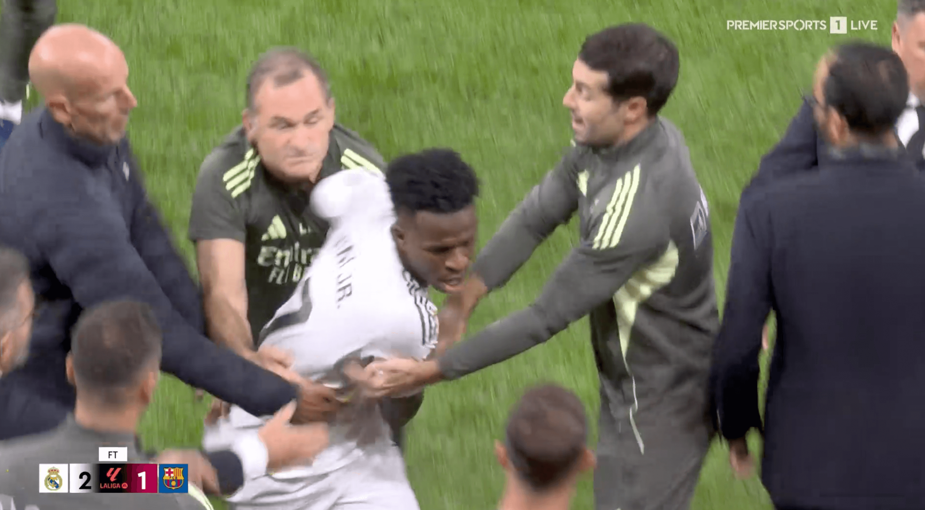 镜头随后切换到场边,被替换下场的维尼修斯和皇马替补门将卢宁正在与费兰-托雷斯和巴尔德等巴萨球员对峙。