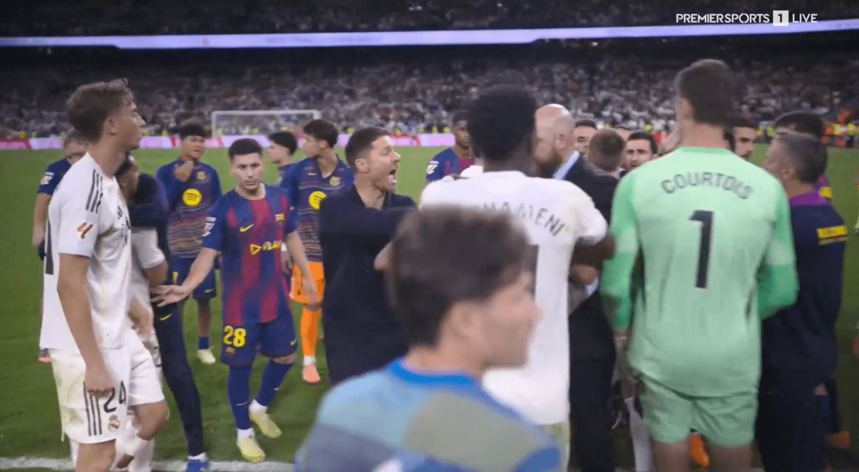 库尔图瓦随后跑了过去,他和亚马尔不得不被分开,加西亚、德容和卡萨多等人挡在他们中间。在双方球员和工作人员的围观下,迪亚斯和托雷斯互相推搡。米利唐正在和加西亚争吵,而阿隆索和楚阿梅尼则在拉米利唐。
