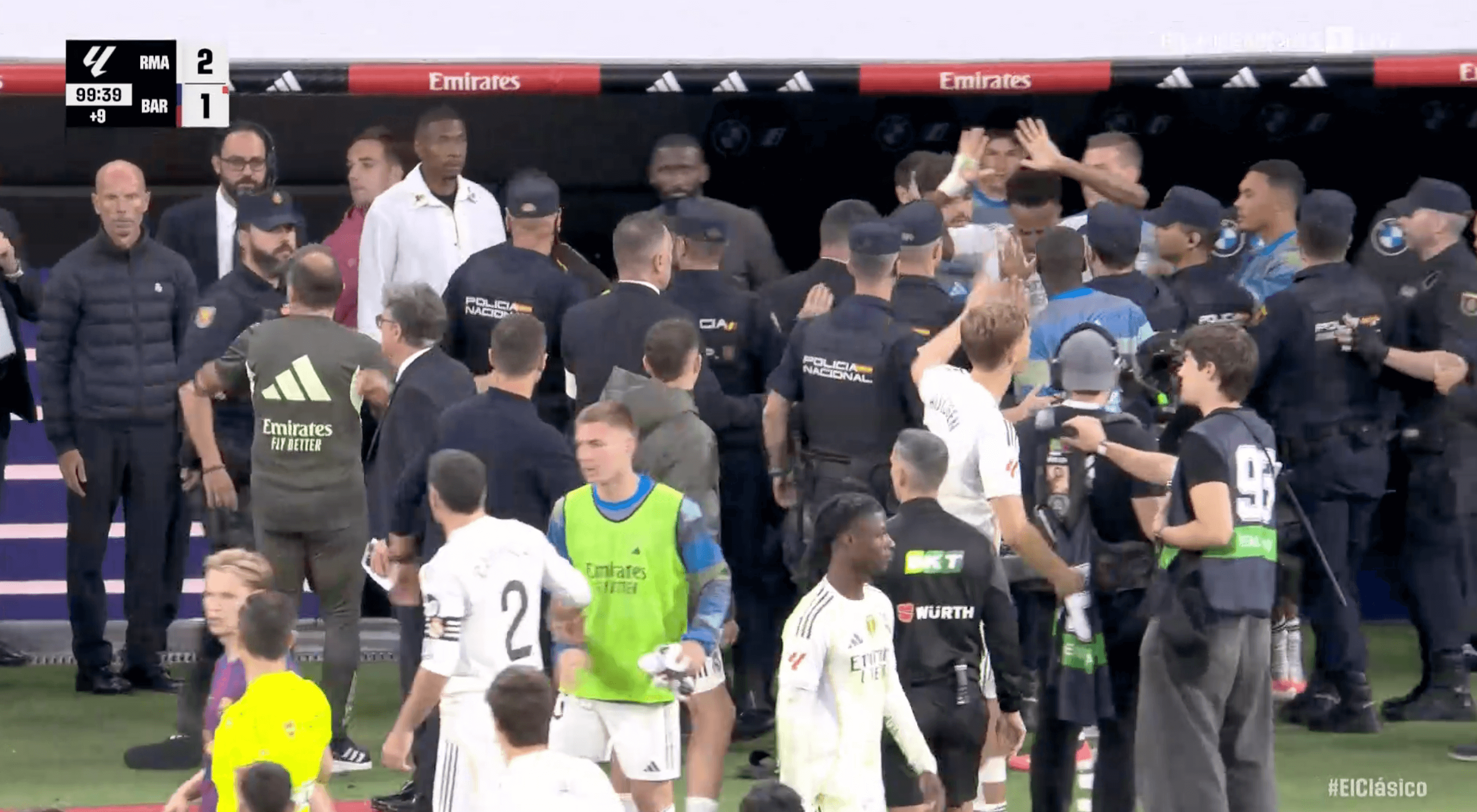 巴尔韦德、米利唐、贝林厄姆、吕迪格和阿拉巴(后两人受伤,未进入比赛日大名单)都跑向了巴萨的替补席,巴萨的拉菲尼亚(也受伤了)和加西亚也参与其中,双方的工作人员也参与其中。