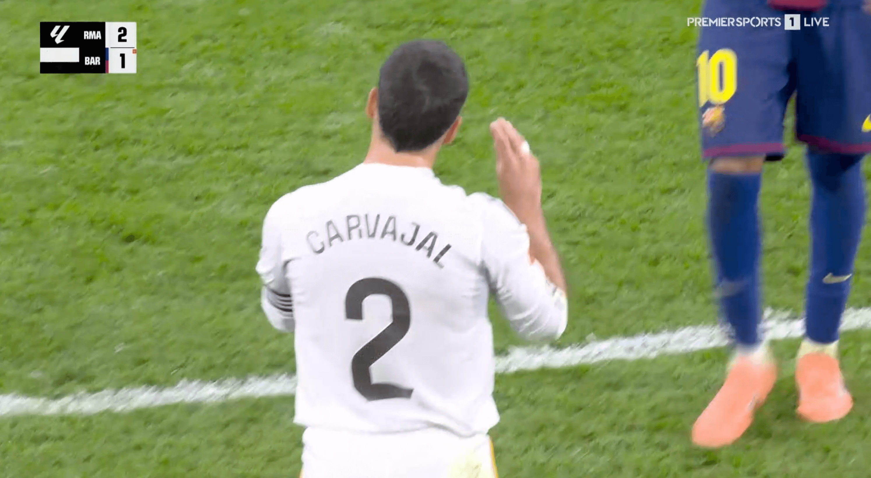 第99分钟,佩德里因对楚阿梅尼犯规领到第二张黄牌被罚下场,皇马球员(包括楚阿梅尼)对这位巴萨中场球员表示同情。