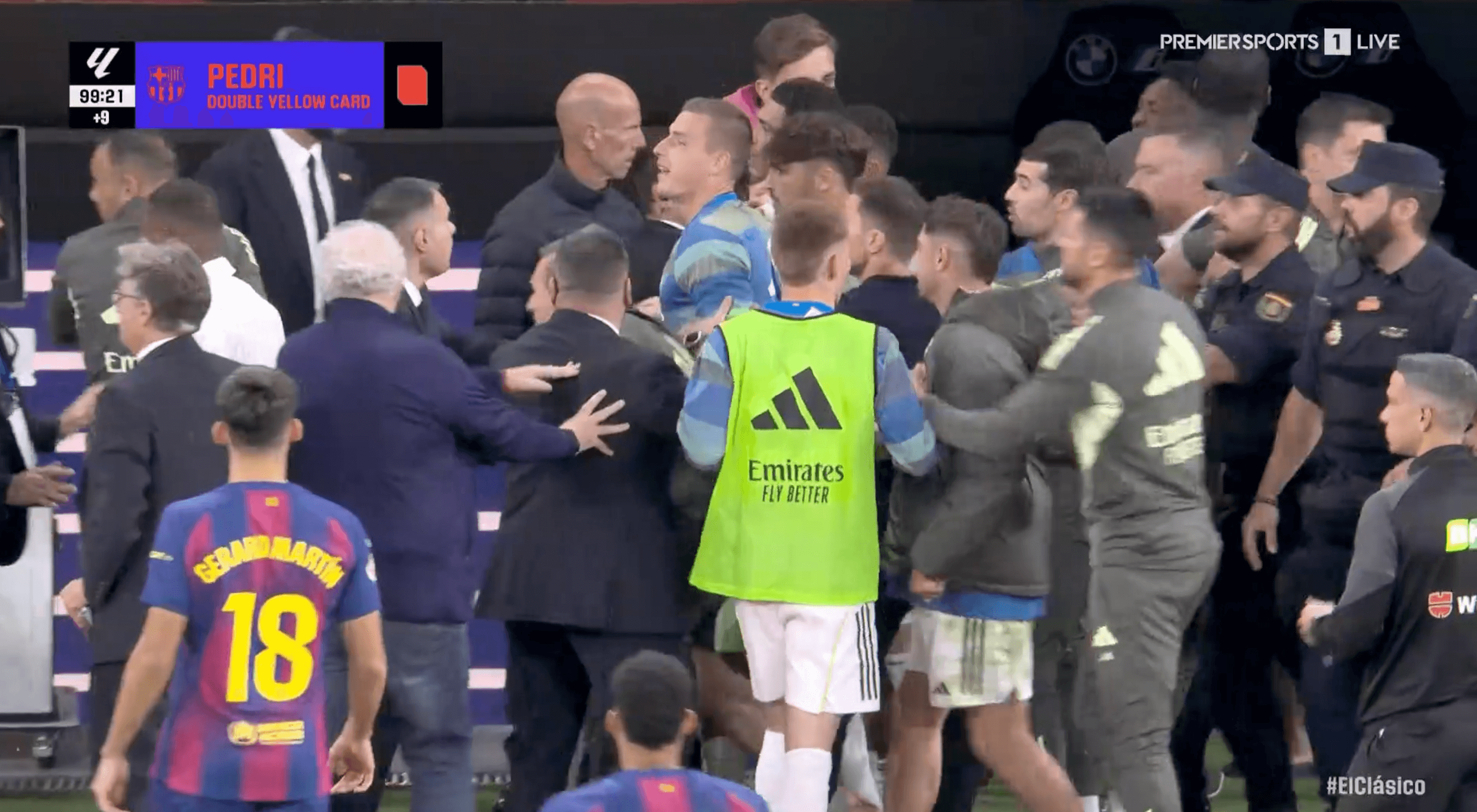 佩德里的红牌点燃了比赛的导火索,终场哨响后,冲突仍在继续。皇马替补球员卢宁因参与争吵被罚下场,其他六名球员也被出示黄牌。