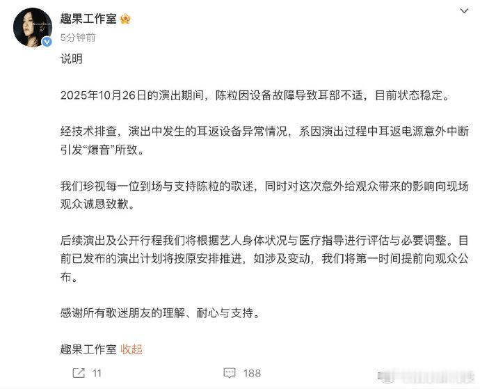 陈粒工作室报平安 27日,陈粒方发布说明:“2025年10月26日的演出期间,陈粒因设备故障导致耳部不适,目前状态稳定。