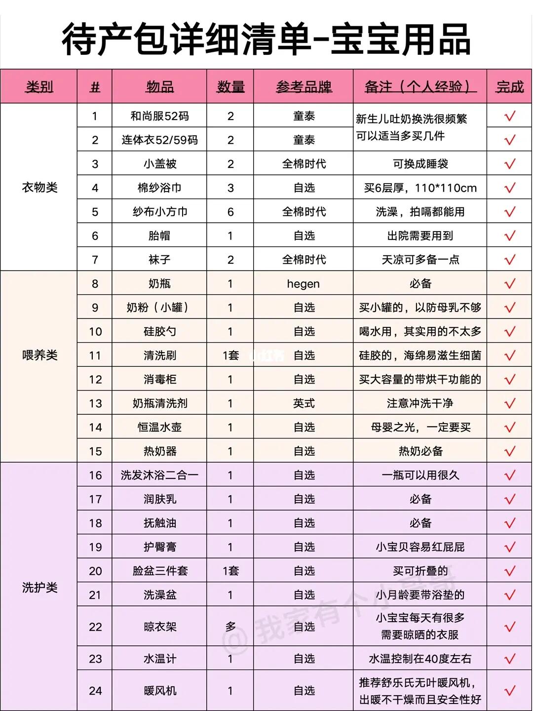 两次产后复盘总结,想想其实待产包很多东西是没有必要的,整理了超精简实用的待产包分享给没生的姐妹! ▶️待产包分为:产房包和住院包,产房包其实就是从住院包里拿出一些生产当日产房所需的物品,不用买两份哦! ▶️大件类物品遇上大促的时候就可以提前准备好了,价格会相差的比较多,可以省不少钱💰 ▶️洗护用品不要买多,买小瓶一点的就可以了,一来宝宝用量少,二来不合适方便买新的不浪费。 ▶️秋冬衣物干的慢可以适当多买一点,宝宝突发情况像吐奶,尿出等会换的比较勤。