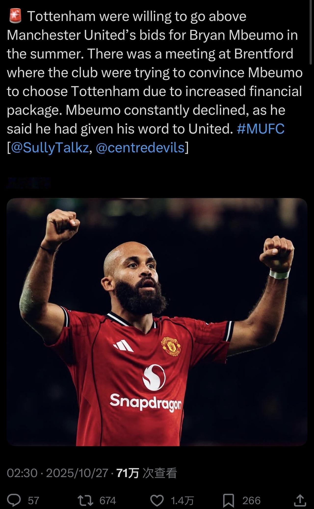 托特纳姆热刺愿意在夏天为布姆贝莫开出高于曼联的报价。俱乐部在布伦特福德举行了一次会议,试图说服姆贝莫选择托特纳姆热刺,因为后者的薪资待遇更高。但姆贝莫一直拒绝,因为他声称自己已经向曼联承诺。