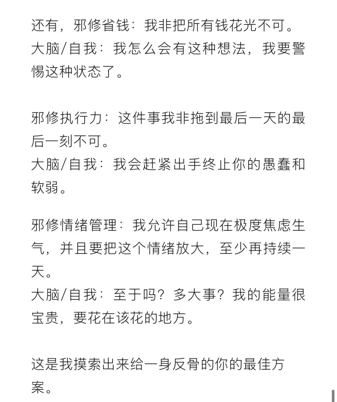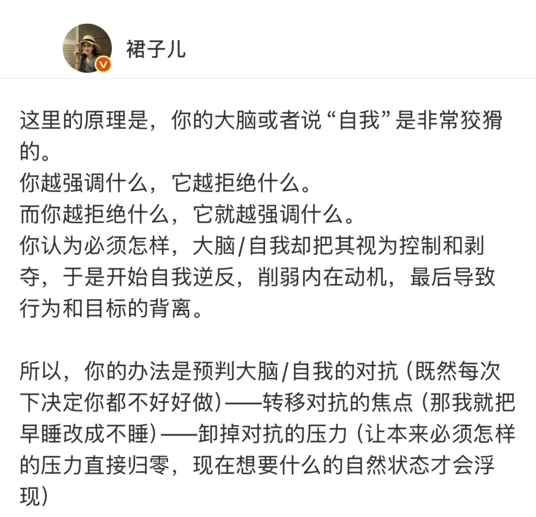 所以,你的办法是预判大脑/自我的对抗(既然每次下决定你都不好好做)——转移对抗的焦点(那我就把早睡改成不睡)——卸掉对抗的压力(让本来必须怎样的压力直接归零,现在想要什么的自然状态才会浮现)