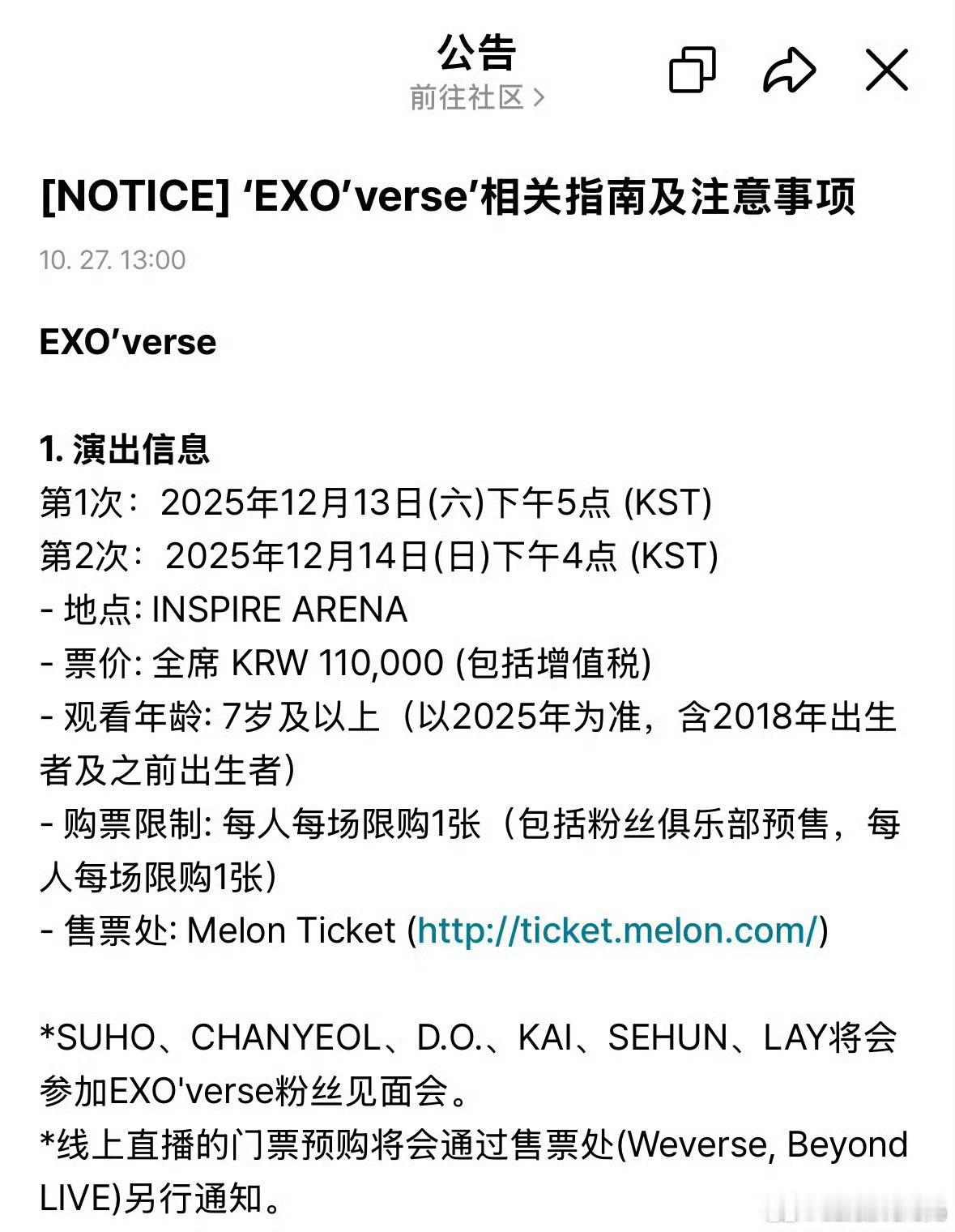 EXO官方发布公告,张艺兴将参加12月13日和14日举办的EXO粉丝见面会。