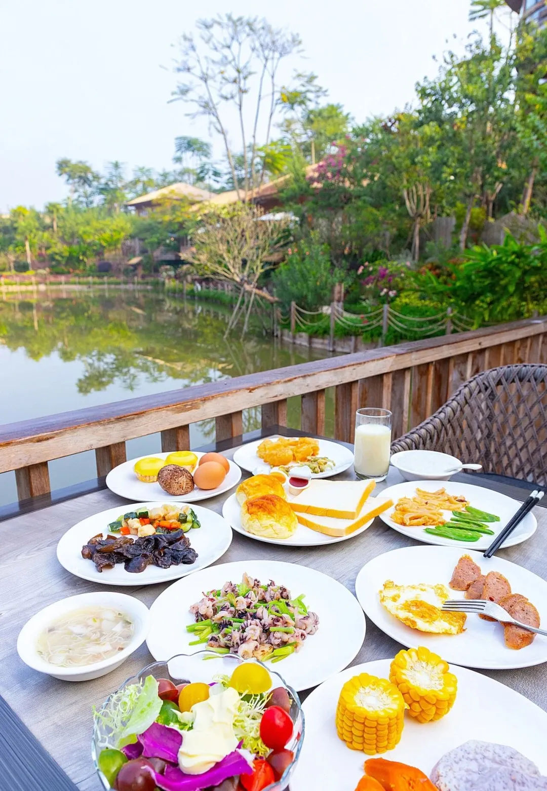 餐饮也不用愁!套餐里含2大2小早餐(1.4m以下娃免费),还有迎宾水果、夜间暖心甜汤,温泉套餐还送双人下午茶,坐在湖畔吃着小蛋糕,风都是甜的!