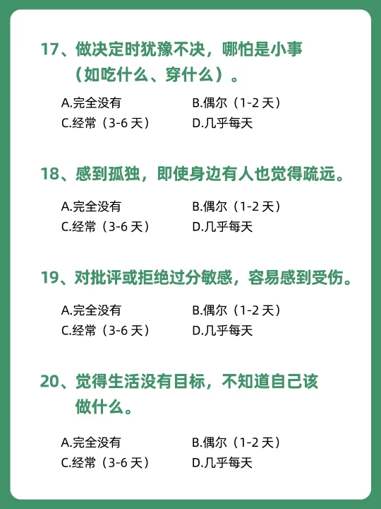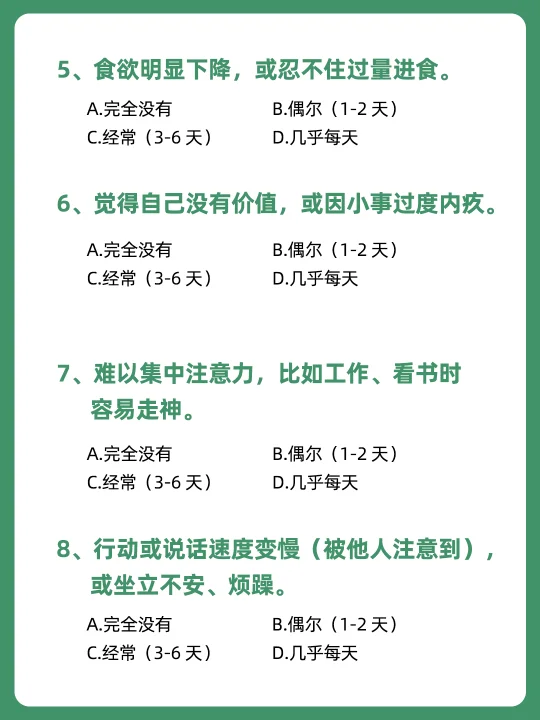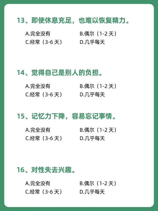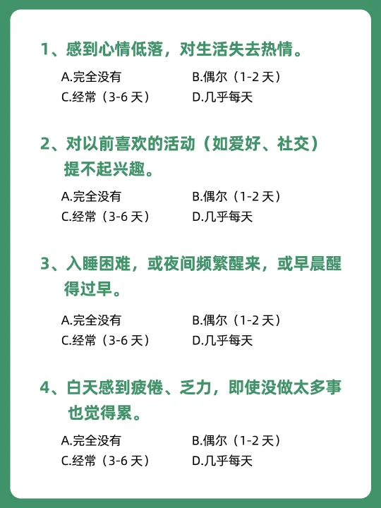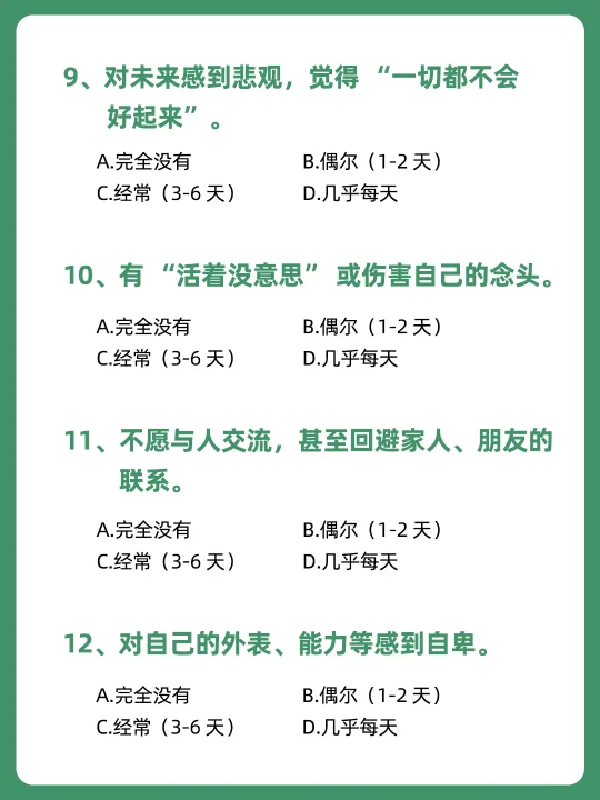 “这份国际通用的专业抑郁自测量表,能帮你科学评估当前情绪状态。请根据最近两周的真实感受回答,结果仅供参考。”
