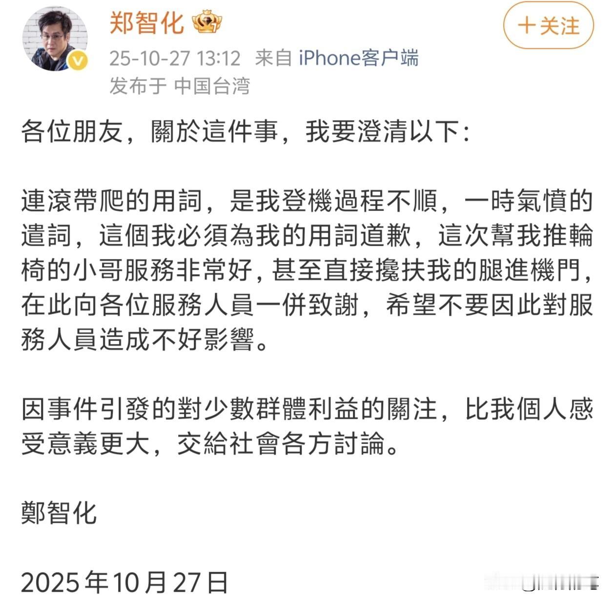 郑智化道歉了! 事情发展的有点太快,第一天郑智化发文炮轰时大家还为郑智化抱不平,第二天视频出来后舆论反噬,到第三天(27日)郑智化发文道歉。 随着郑智化道歉,这件事估计就此结束了,不过对郑智化个人的影响可能是深远的。一是郑智化经过这一次事件,个人形象在大陆会大幅下降,二是此后在大陆找他商演的公司也要再三考虑了,郑智化在大陆的工作机会因此可能会大幅下滑。