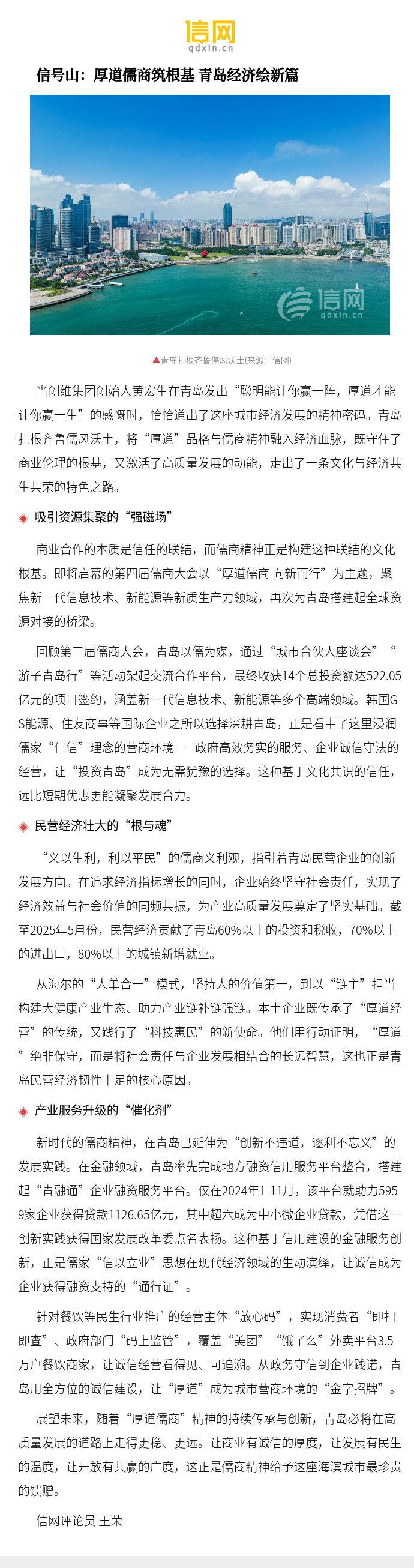 【信号山:厚道儒商筑根基 青岛经济绘新篇】展望未来,随着“厚道儒商”精神的持续传承与创新,青岛必将在高质量发展的道路上走得更稳、更远。让商业有诚信的厚度,让发展有民生的温度,让开放有共赢的广度,这正是儒商精神给予这座海滨城市最珍贵的馈赠。 信号山:厚道儒商筑根基 青岛经济绘新篇
