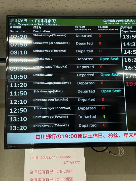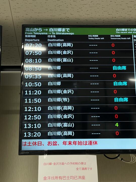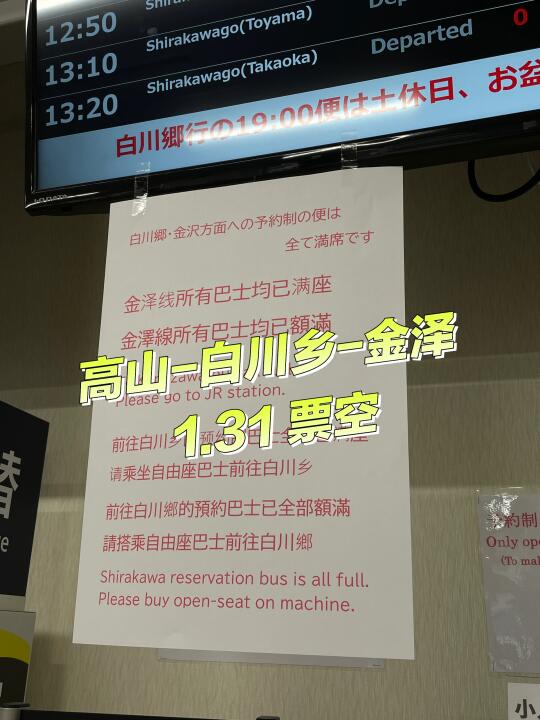 从高山去白川乡、金泽的姐妹,建议大家一定提前网上购票,凭邮件信息可以直接乘车,指定坐,不用担心现场排队上不去,今天现场看到票已售空,只有自由坐就是排队上车。