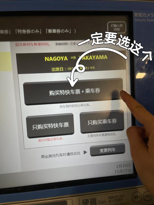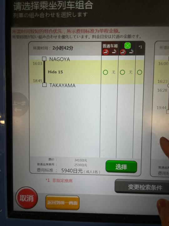 在名古屋站JR票机器上现场买票,随走随买,我们是16:04这趟,大概提前半小时来买票。记住是面对JR入口左边的机器(大概有三四台)选择中文界面,丝滑购票。