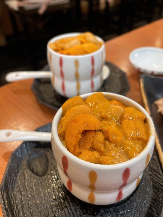 厨师上菜时会一一介绍,然而他说的是日语[doge]假装听懂OK OK OK,抓紧开吃!厚烤飞驒牛真是好嫩,生鱼也很新鲜,尤其是海胆蒸蛋,简直一口封神。餐后的布丁是本店自制,意外的好吃,甜而不腻。
