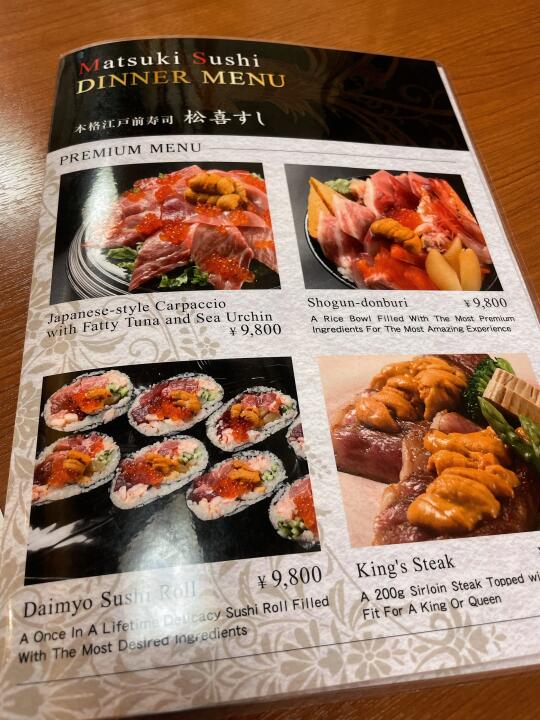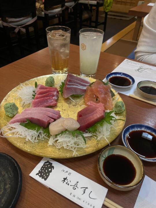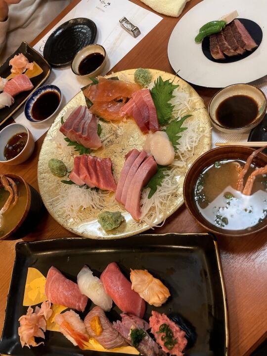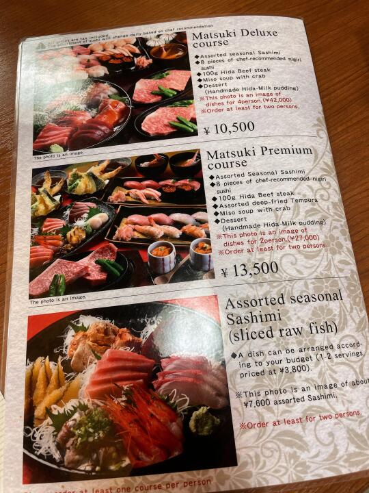 ⭕️注意,套餐需要两人起点。推荐13500的套餐,两人是13500*2💰(这里可能有人看菜单会理解错,菜单图片上是双人套餐的份量,但菜单价格是单人价,要留意菜单上红色字的提醒)如图:两人的份量总共有10贯寿司、6种生鱼、海胆、烤飞驒牛、天妇罗🍤、蟹腿汤。果断选了这个套餐很全,想吃的都有。