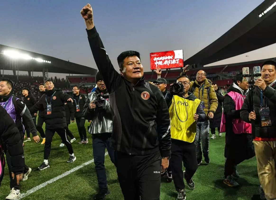 辽宁铁人的主教练李金羽和球员们一起振臂高呼。为了这一刻,他们付出了太多,也等待了太久。作为辽宁铁人冲超的主要功臣,李金羽在去年7月份开始担任俱乐部主教练。上赛季,他带队拿到了中甲第4名。