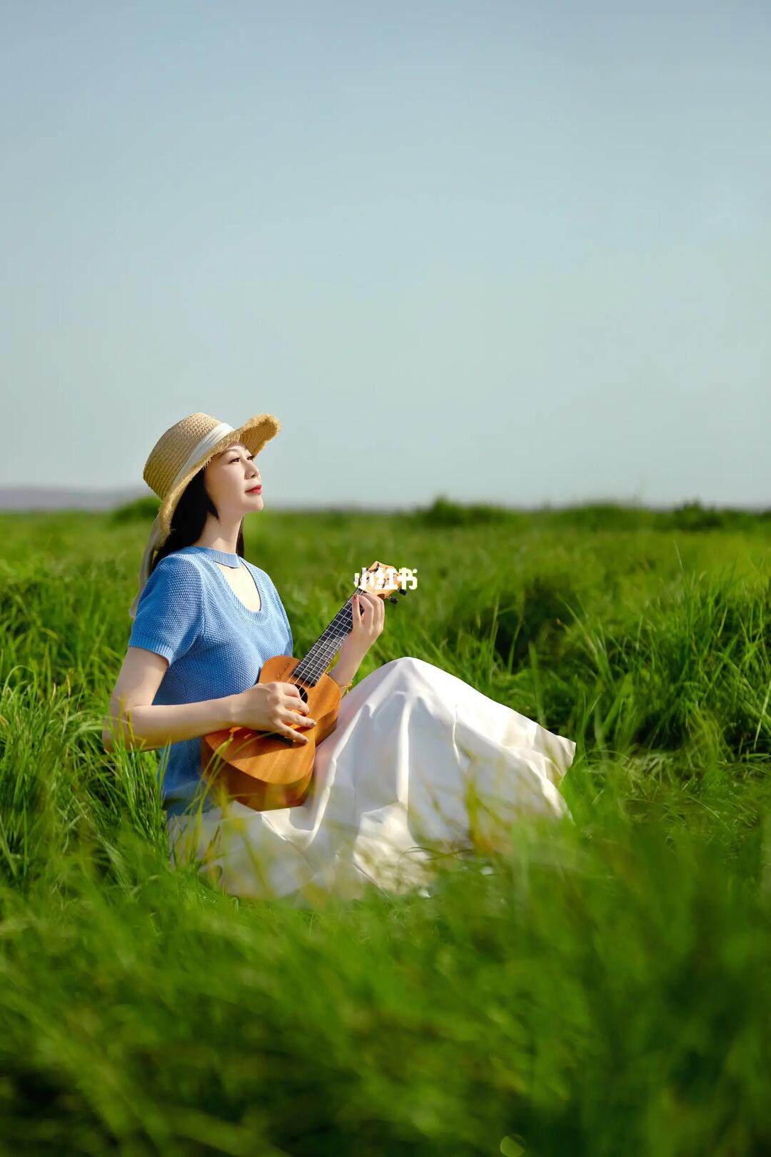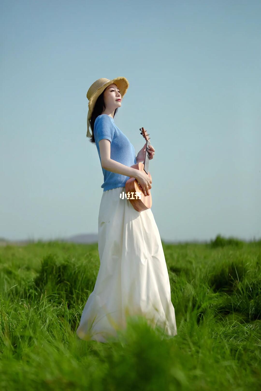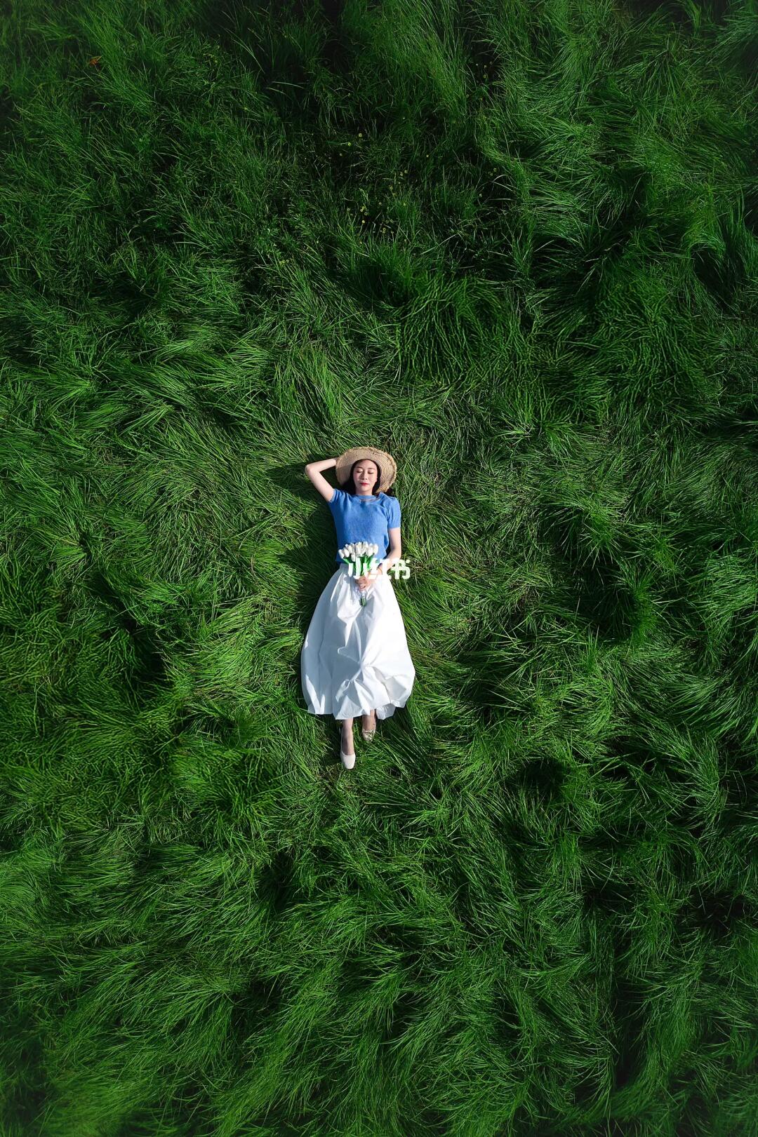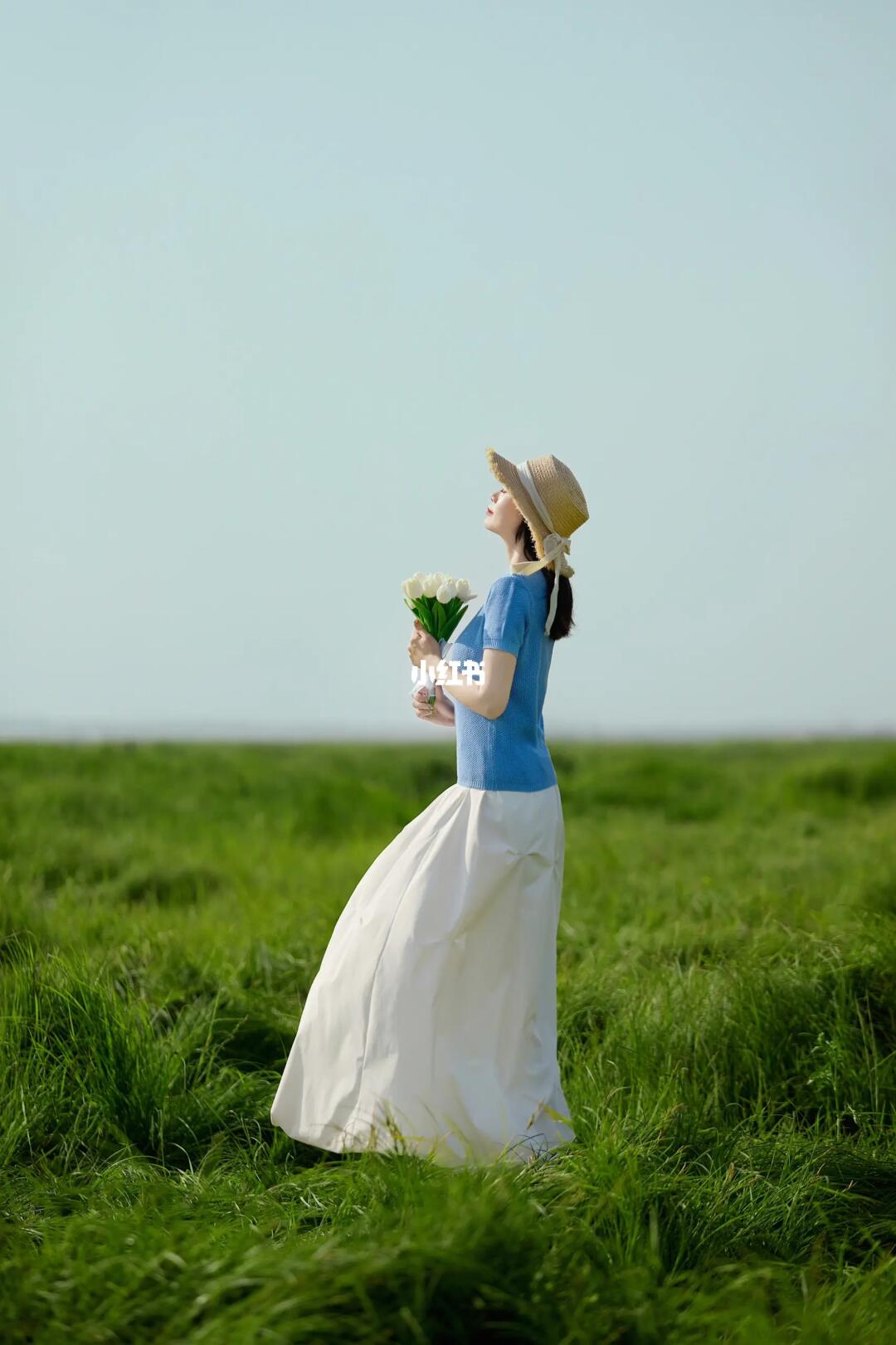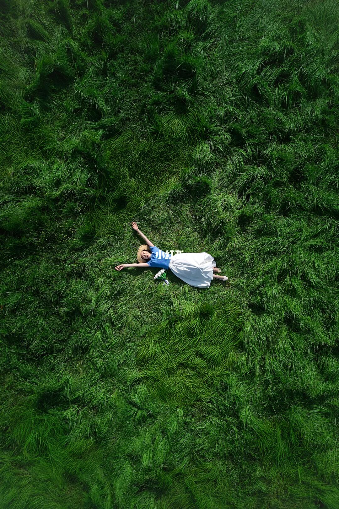2️⃣无人机高空俯拍:浅色衣服与绿海形成对比,画面纯净又高级。