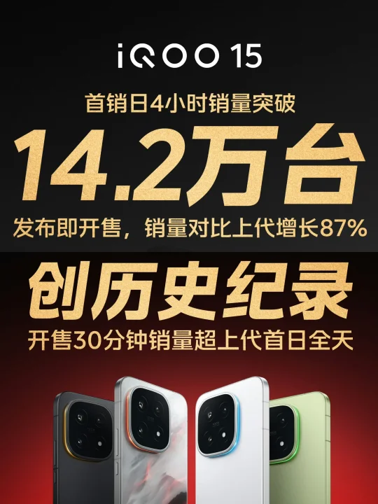 最近这波新旗舰 如果想挑一台均衡近乎无短板的 墙裂推荐iQOO 15‼️ 首销数据一出来 4小时狂卖14.2万台 30分钟就超过上代首发全天 尊嘟太牛啦 说明iQOO 15本身的产品力够强 是受到大家一致认可的 今天来跟大家快速盘一盘它有哪些硬实力‼️ . 1️⃣重视游戏体验的游戏党 第五代骁龙8至尊版➕自研电竞芯片Q3的“双强”组合 性能强不罕见 但性能强的同时 集全场景光追、超分、超帧 于一体的现在几乎找不到 这游戏视效你就玩吧 一玩一个巴适 游戏场景无惧卡顿 . 2️⃣GYDDY的周边配置 除了性能猛、游戏体验好 iQOO 15这次的马达和扬声器也都有升级 大师级双扬➕大尺寸双轴振感马达的组合 搭配做过游戏适配的触感和听感反馈 游戏体验更沉浸 . 3️⃣续航yyds 7000mAh大电池真的顶! 早上满电出门,出门一天回来还有电 100W闪充充电速度更快了 这次也给安排了实用的无线充电 . 4️⃣适合摄影爱好者 5000万三摄➕潜望长焦 拍夜景比上代还要好 日常记录、旅行拍照都够用 . 5️⃣颜值在线 机身采用金属中框 握持手感好 外观颜值也很高 带出门妥妥时尚单品 . 怪不得iQOO 15首销能卖爆 4199💰起的价格 能买到性能、游戏体验、续航、影像、颜值全在线的旗舰机 如果最近双十一想换新手机的 iQOO 15闭眼冲就对了‼️