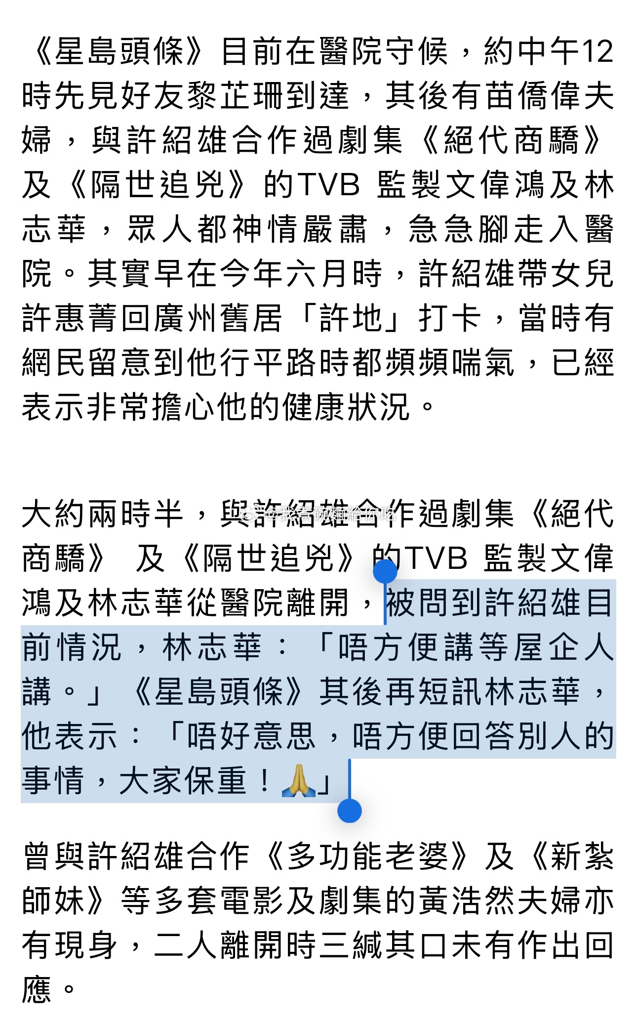 港媒目前在医院守侯,先后见到苗侨伟夫妇、黎芷珊、黄浩然及TVB监制赶到医院。问到许绍雄目前情况,TVB监制林志华:「不方便讲等家里人讲。」 黄浩然离开医院时也未有作出回应。
