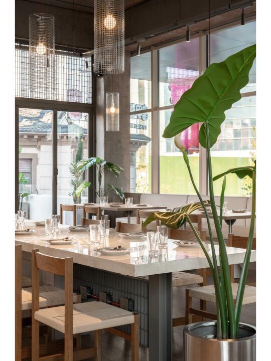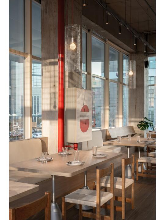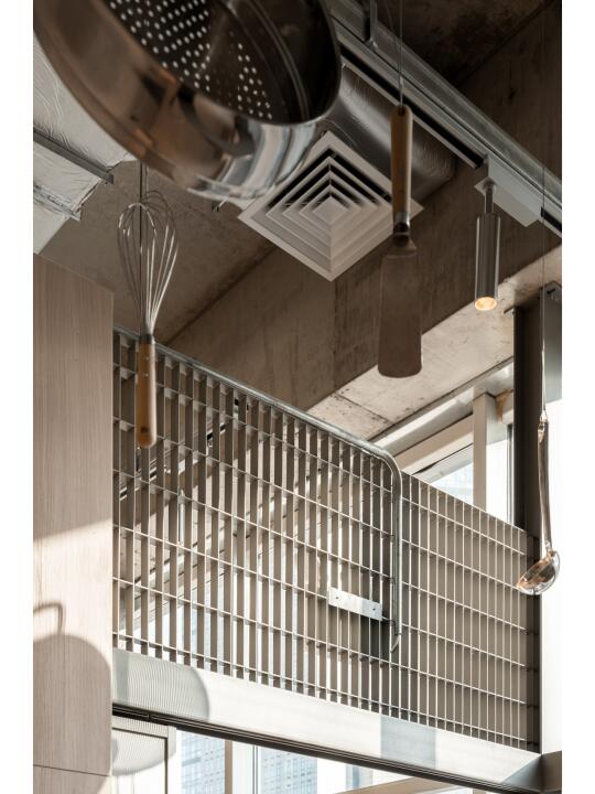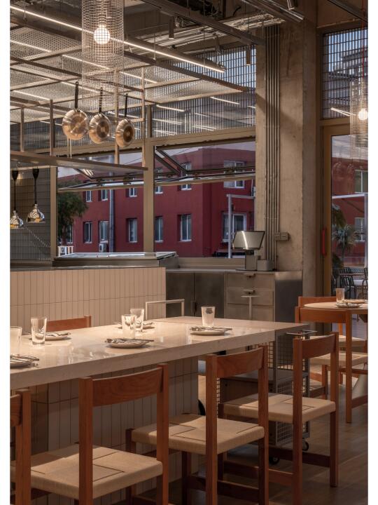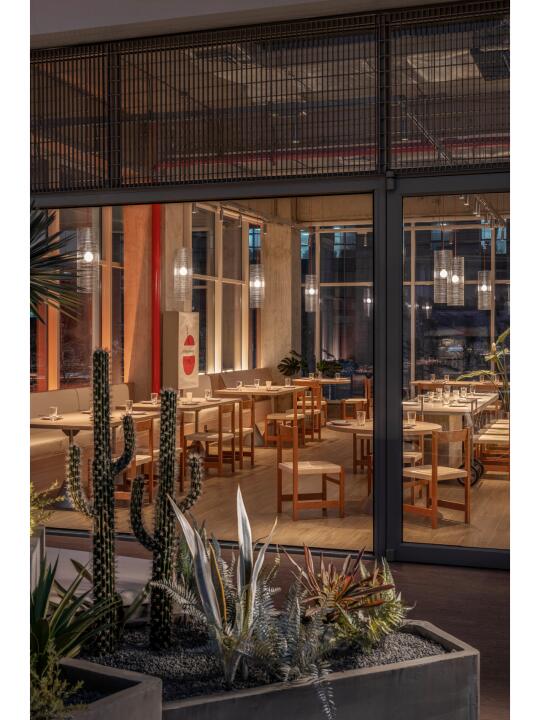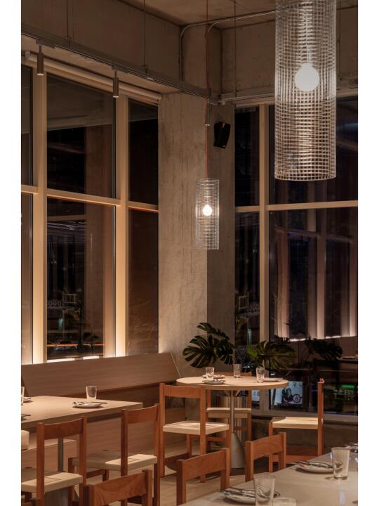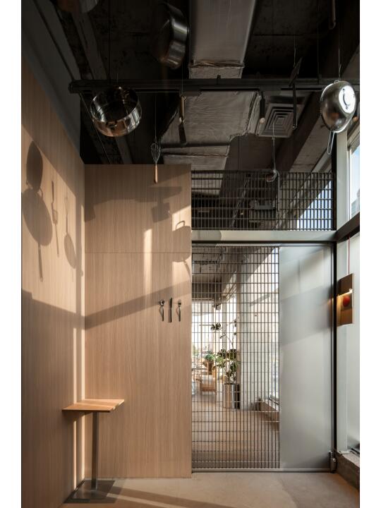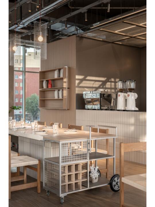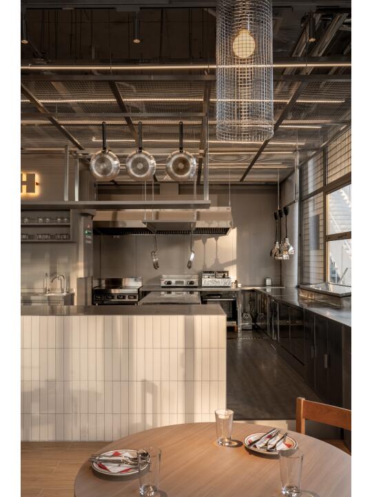 设计策略是将厨房与功能性空间作为“舞台”植入在中间区域。四周则为动线和经营区域,将玻璃与景观给到客人。
