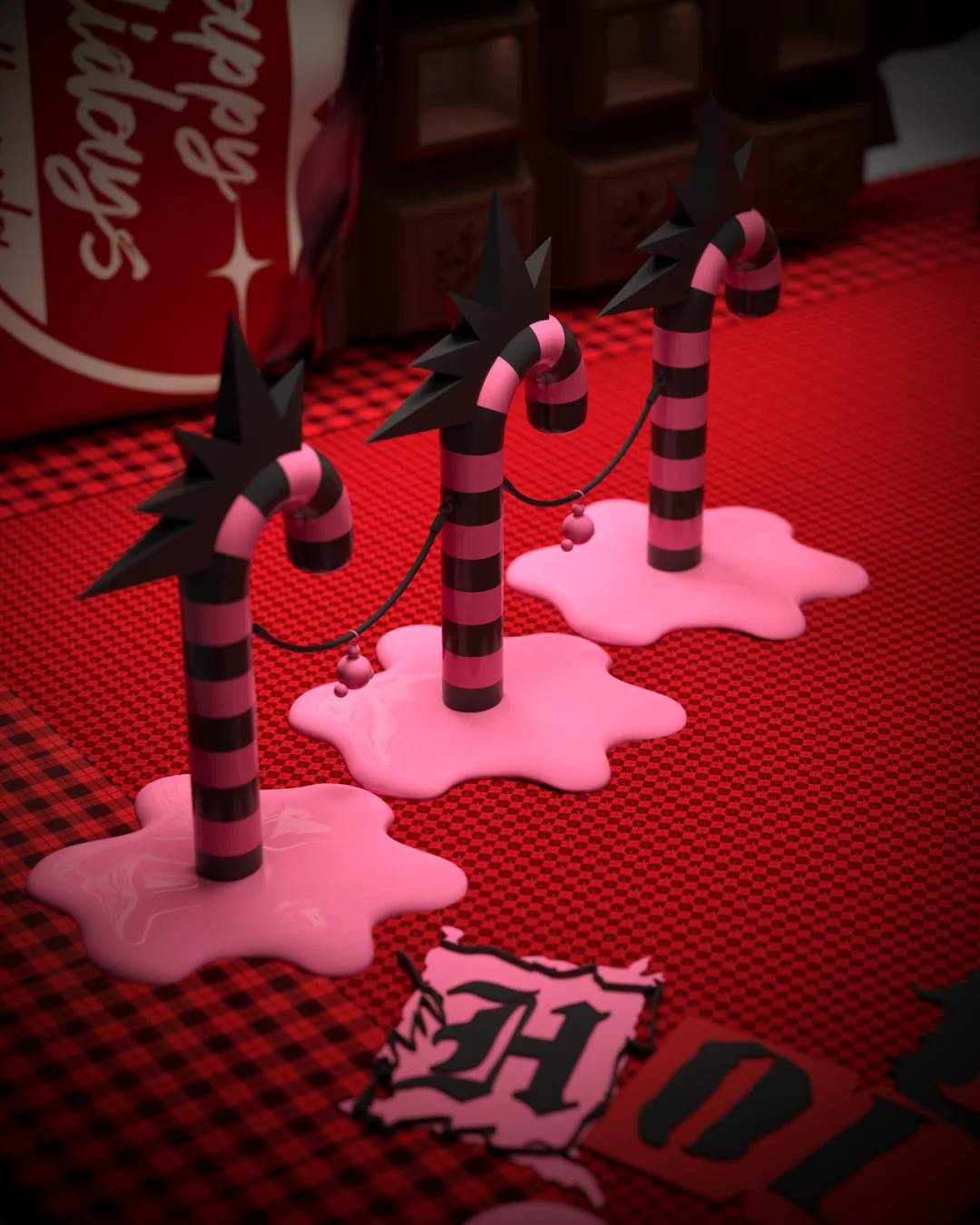整体色系采用SKULLPANDA初期的颜色配比——红与黑,辅以部分金属质感配合呈现,把朋克摇滚的精神体现的淋漓尽致。