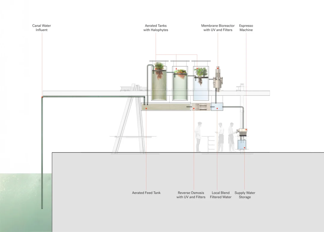 Canal Café 位于威尼斯军械库(Arsenale)边缘的运河旁,直接从运河取水,通过一套“自然 + 人工”复合过滤系统,将海水净化为可饮用水,冲煮出带有威尼斯之味的浓缩咖啡。