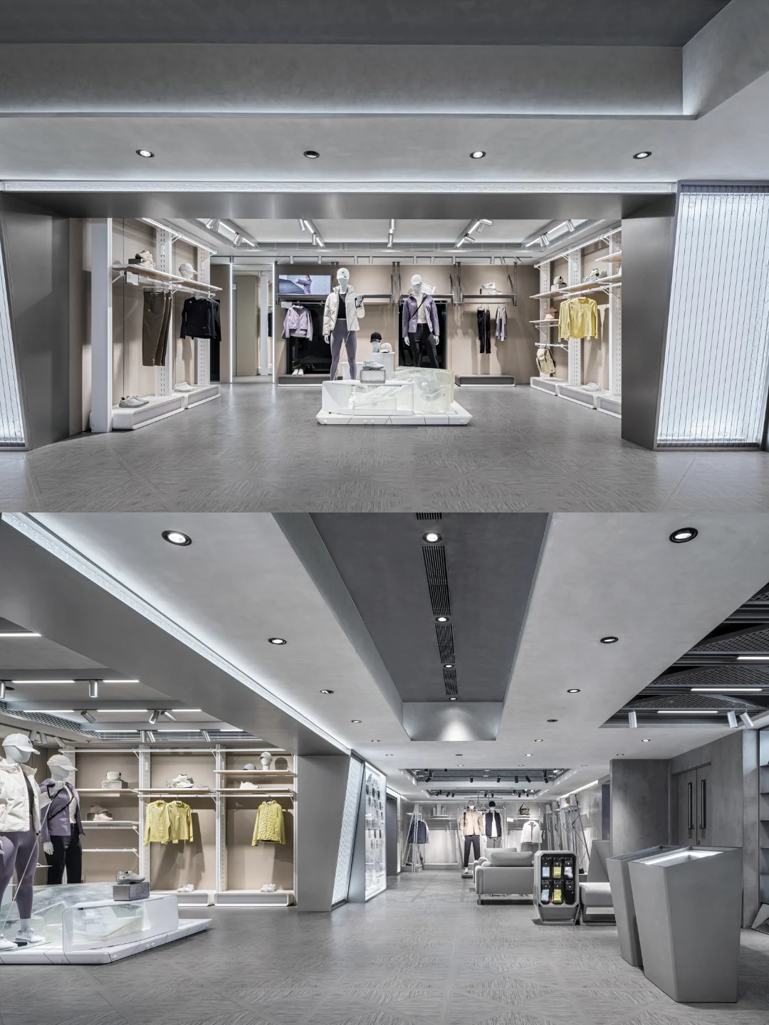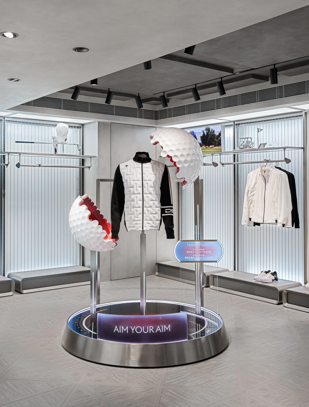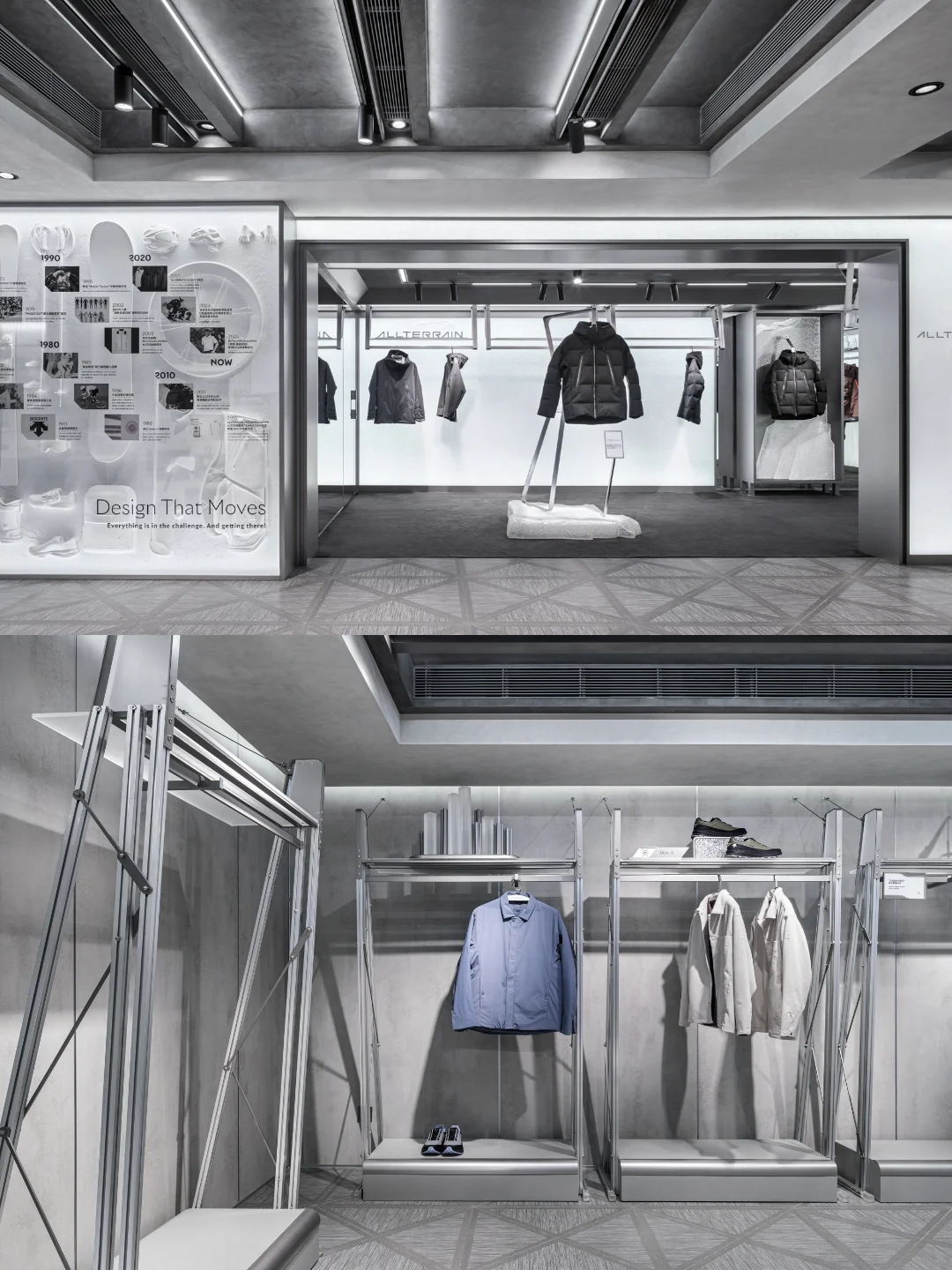整个门店以中央岛台为核心节点,串联滑雪装备展示、互动体验区等多个场景。线性动线模拟“滑翔路径”,配合灯光与铺装节奏变化,使观者在空间中获得一种“速度的心理暗示”。