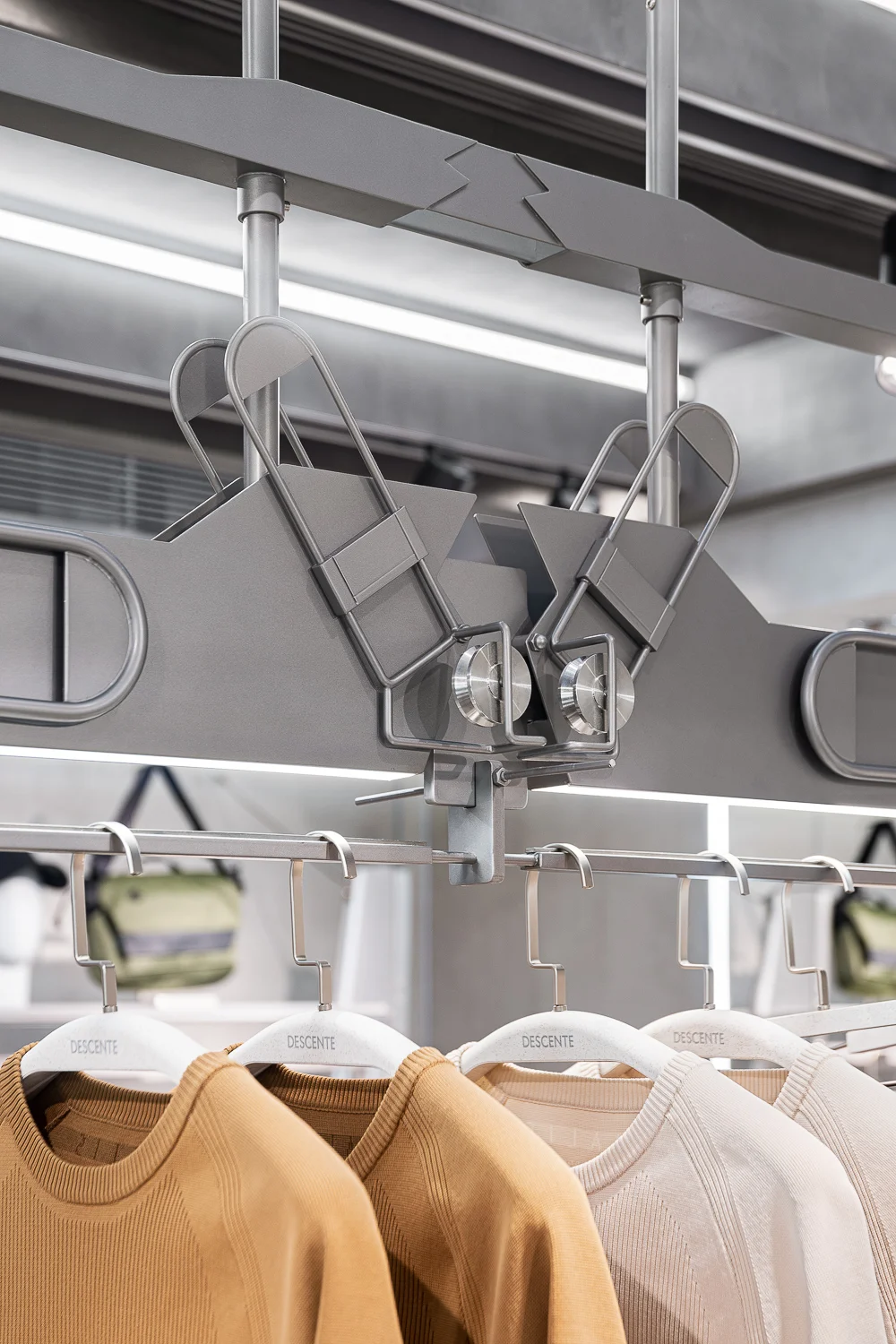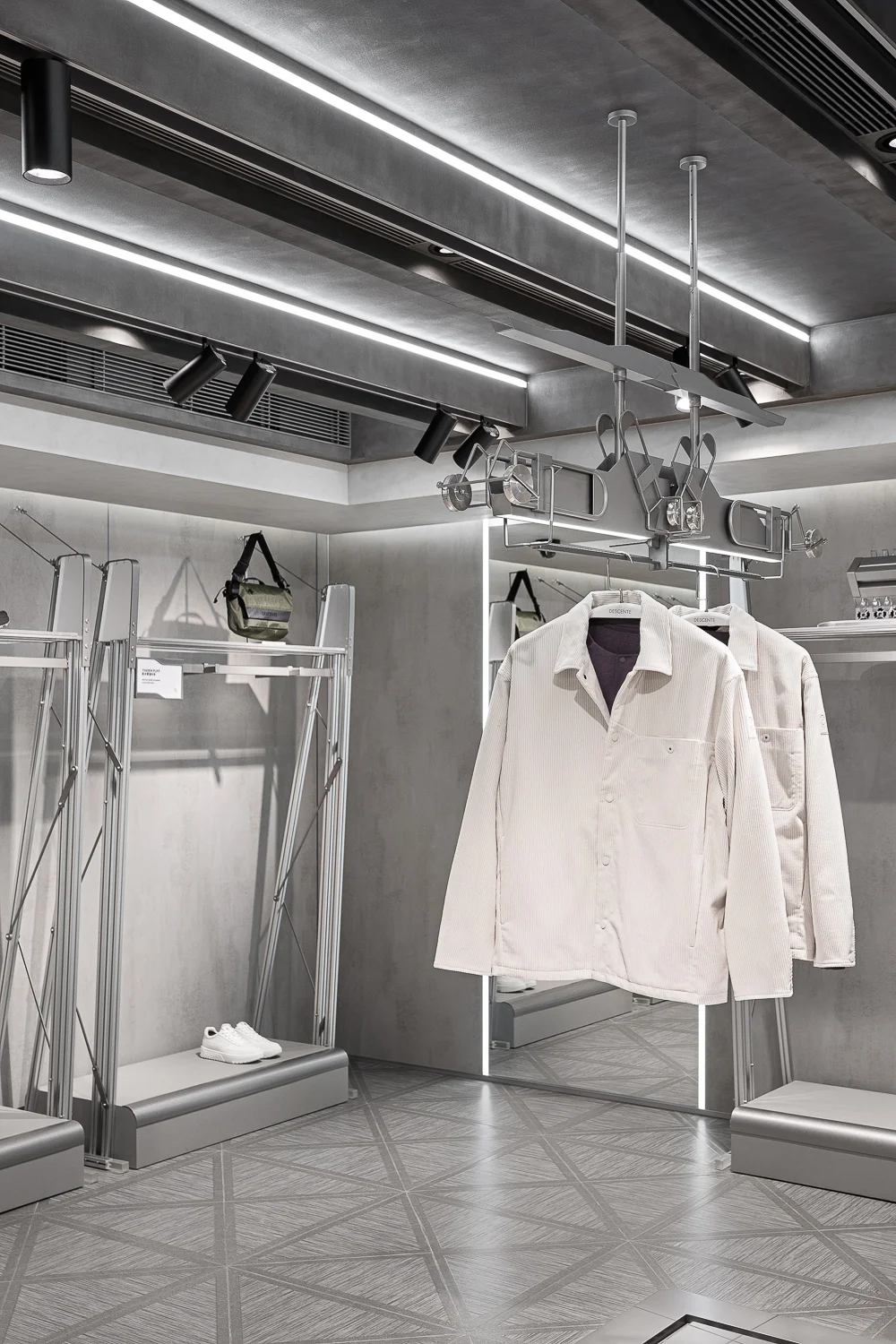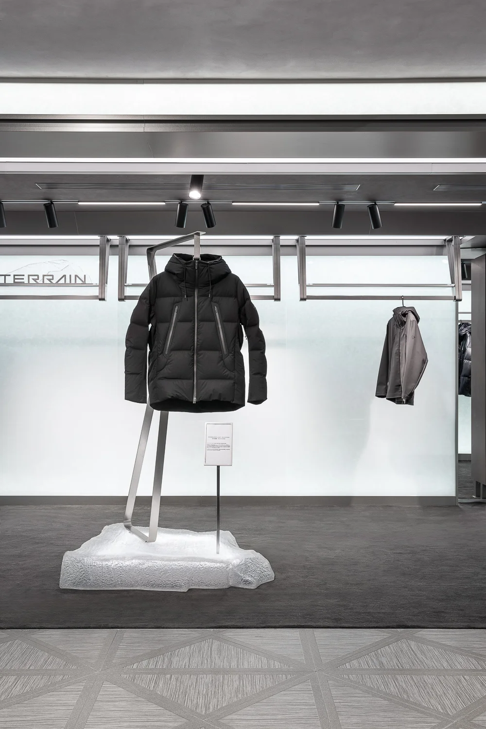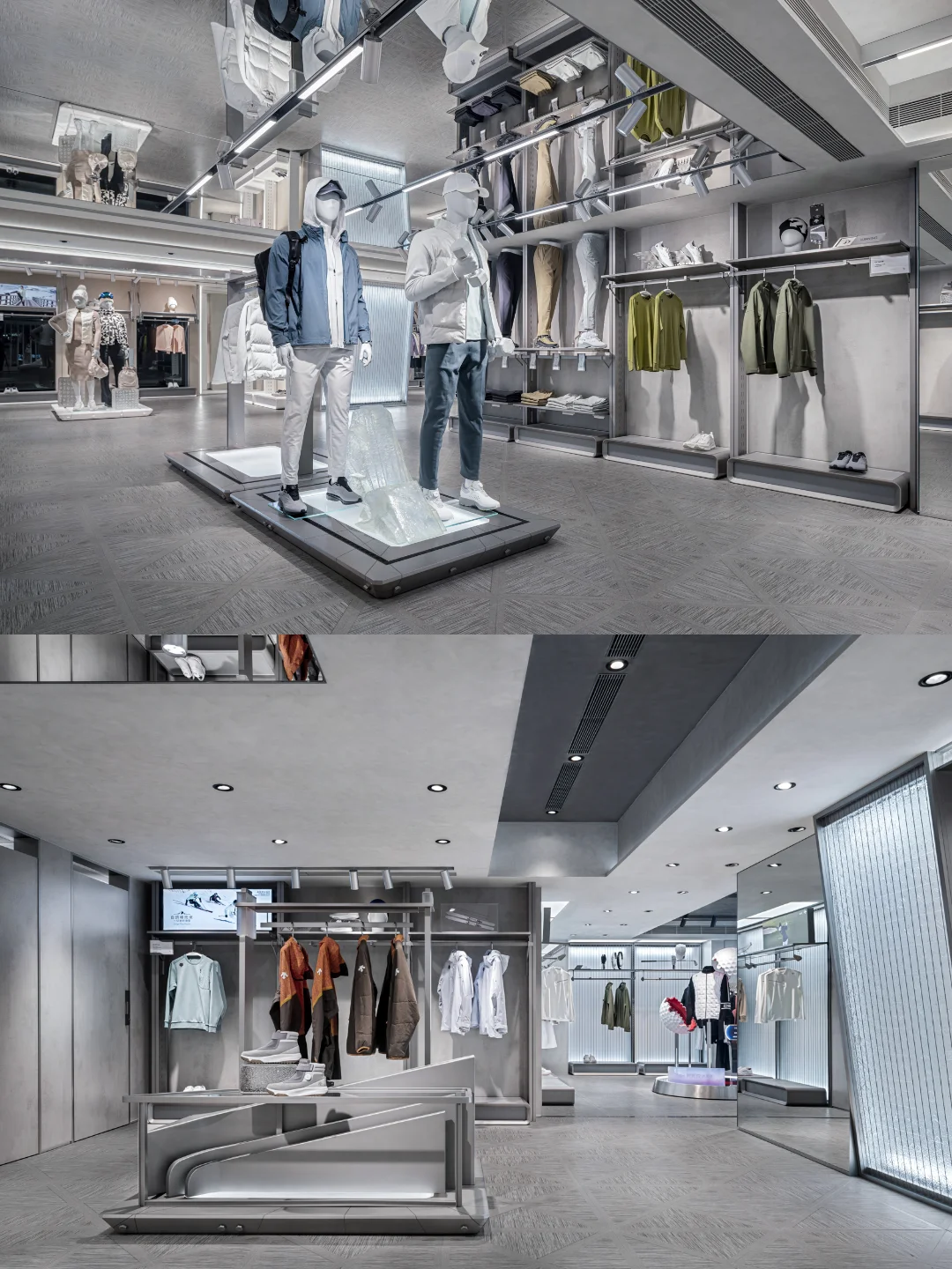 整个门店以中央岛台为核心节点,串联滑雪装备展示、互动体验区等多个场景。线性动线模拟“滑翔路径”,配合灯光与铺装节奏变化,使观者在空间中获得一种“速度的心理暗示”。