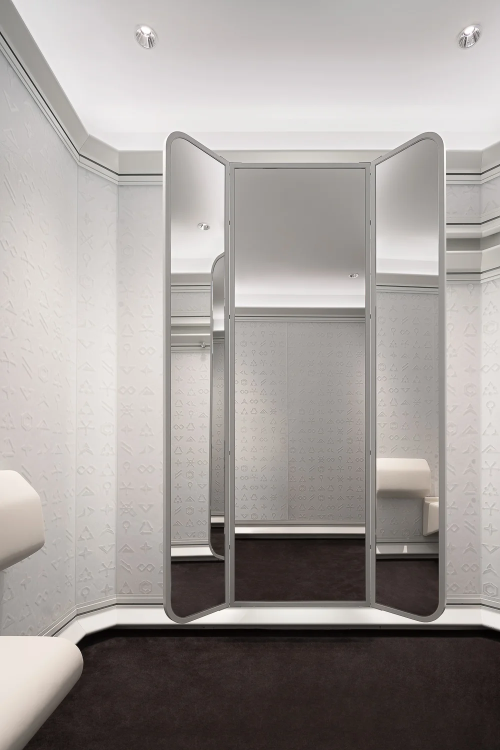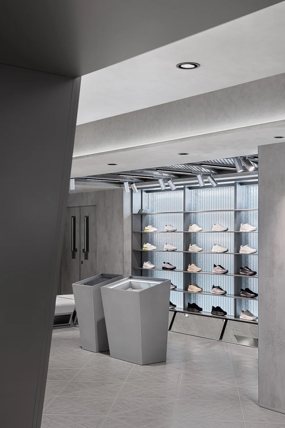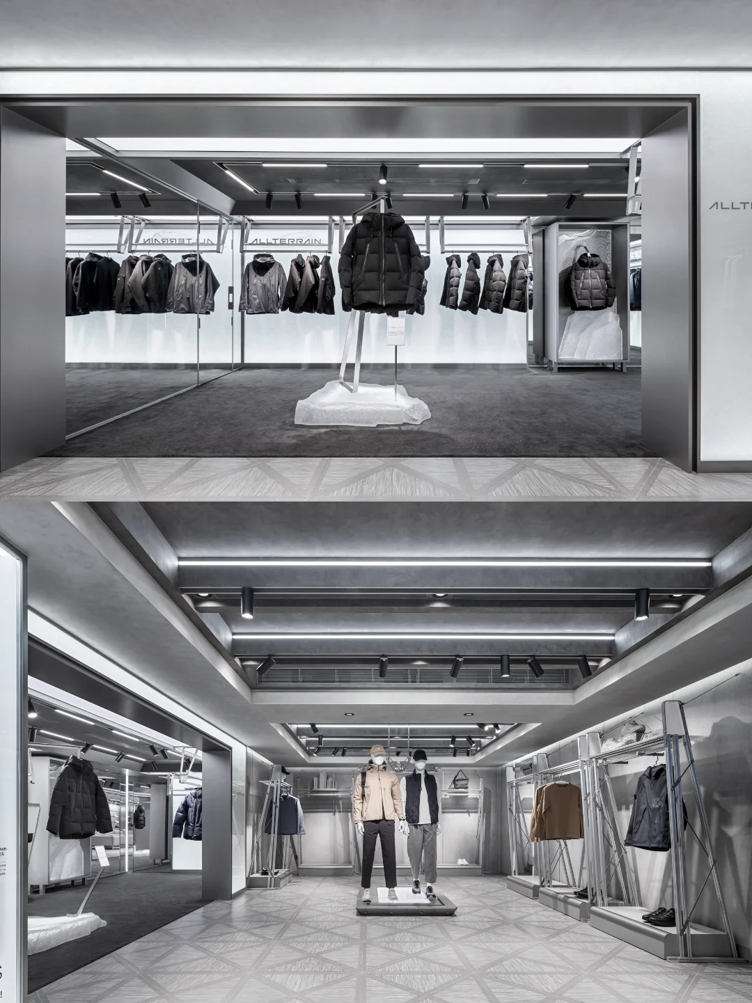 整体空间以银白冷调为主色,打造纯净、极简的冰雪感知入口,地面铺装采用重复菱形模块,模拟滑雪板划过雪面的轨迹感,材料、结构与展陈方式共同指向一种未来感的运动生活方式。