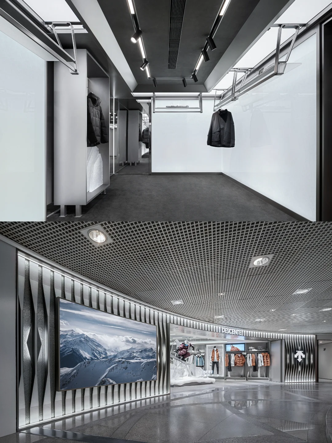 在香港海港城迪桑特,设计团队SPACES 以“明日世界”为灵感将冰雪运动的核心精神——速度、挑战、共振,转译为空间的结构与语义基础。从“滑雪始源”出发,空间被划分为三重叙事维度:
