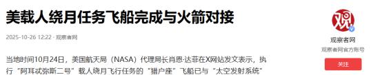 美国航天局宣布!   10 月 26 号财联社发的这条航天消息,在业内着实掀起了不小的波澜:NASA 代理局长肖恩・达菲对外宣布,阿耳忒弥斯 2 号任务的猎户座飞船已经和太空发射系统火箭稳稳完成 “牵手” 对接。   往大了说,这可是美国自 1972 年阿波罗 17 号任务结束后,时隔 54 年第一次真正把载人深空飞行摆上实操日程,难怪航天圈的人都觉得这事儿分量极重。   阿波罗计划画上句号后,美国航天的注意力渐渐从深空转向了近地轨道 —— 先折腾出航天飞机,后来又牵头建了国际空间站,深空探索这块基本就搁下了。   直到 2017 年阿耳忒弥斯计划正式亮相,才算把 “重返月球、建长期基地” 的目标明明白白摆出来,而这次完成对接的猎户座飞船和 SLS 火箭,正是这个计划的核心组合。   先说对接的两个主角。那个叫 “太空发射系统” 的火箭,简称 SLS,论起渊源算是航天飞机的 “升级款亲戚”,2011 年就定了设计方案,前前后后折腾十几年才总算成熟。   这大家伙竖起来足有 98 米,跟 20 层楼差不多高,重量达到 2500 吨,起飞时能爆发出 3810 吨的推力,比当年阿波罗用的土星五号还强劲,堪称美国专为深空探测打造的 “最粗大腿”。   至于火箭顶上的猎户座飞船,讲究就更多了。洛克希德・马丁公司前不久刚给它敲定了 “诚信号” 这个名字,舱内空间比阿波罗飞船大了 2.5 倍,能妥妥装下 4 名宇航员。   最关键的是那 5 米直径的防热罩,能扛住 1763℃的高温 ——2022 年阿耳忒弥斯 1 号无人任务时,这防热罩甚至经受过 2800℃的再入高温考验,这次载人飞行,全得靠它护住宇航员的性命。   有意思的是,这次对接并非在太空中进行,而是在肯尼迪航天中心的航天器装配大楼里完成的。   10 月 19 日,“诚信号” 被运进大楼,技术人员操控起重机把它稳稳吊到 SLS 火箭顶端,一直到 10 月 24 日,才算真正完成对接。   达菲在 X 平台上特意提了一嘴,说这一步标志着任务进入关键阶段,接下来团队要给飞船和火箭接上电力、数据线路,搭起 “脐带” 似的连接通道,还得做一整套集成测试,确保俩大家伙能默契配合。   等这些活儿都干完,明年 2 月前后,整装待发的火箭和飞船会被运到发射台,进行加注燃料的湿式彩排,为发射做最后铺垫。   按照计划,阿耳忒弥斯 2 号会在 2026 年 4 月的发射窗口期升空,整个任务要持续 10 天。   这 10 天里,4 名宇航员可不是去 “太空观光” 的,得实实在在测试一整套设备:像生命支持系统能不能稳定制造氧气、去除二氧化碳 —— 这在深空环境里可是实打实的保命关键;   还得验证推进系统的协同控制能力,万一遇上紧急情况,得能及时调整轨道;甚至会带上人体模型,专门监测深空辐射剂量,搞清楚这玩意儿对人体的影响到底有多大。   值得一提的是,飞船上装了 “四核处理器” 的超级计算机,每秒能处理 4.8 亿条指令,算力是国际空间站计算机的 10 倍。   另外还有 “星敏感器 + 激光雷达” 的双模导航,在地球到月球的轨道上能实现厘米级定位。   更特别的是,飞船还会搭载韩国研发的 K-RadCube 立方星,这颗 19 公斤的小卫星专门在范艾伦辐射带监测宇宙射线,为载人探月的辐射防护攒数据。这些操作,全都是在为将来建月球门户空间站打基础。   不过这事儿看着顺风顺水,背后的麻烦可真不少。SLS 火箭从研制开始就没顺过,2022 年第一次准备发射时,就因为燃料泄漏和飓风捣乱,三次错过了发射窗口,单是液氢燃料系统就出过 11 次泄漏事故。   预算更是一路疯涨,如今整个任务的总成本已经突破 930 亿美元,比最初的预算翻了整整一倍。   参议院拨款委员会早就盯上这事儿了,逼着 NASA 拿出成本控制方案,不然后续登月任务的经费可能就得被砍。   而且原本计划 2024 年实现的载人登月,现在也推迟到了 2027 年的阿耳忒弥斯 3 号任务,这技术风险到底有多大,也就可想而知了。   更头疼的是,阿耳忒弥斯 3 号要用的月球着陆器还没谱,SpaceX 负责的型号进度严重滞后,NASA 都开始重新招标了。   但即便问题一堆,这次对接的分量依然轻不了。它接了 2022 年阿耳忒弥斯 1 号无人测试的班,算是把 “重返月球” 从纸面上的规划,真正往实处推了一大步。   更值得留意的是,这事儿可不是美国自己的独角戏:欧洲航天局为飞船提供了服务模块,诺斯罗普・格鲁曼这类商业公司也参与了火箭制造。   这种 “官方 + 商业” 的模式虽说能降低成本,但也让系统整合的难度陡增。这次猎户座和 SLS 的成功对接,好比给这场漫长的太空征程搭好了第一块关键积木。