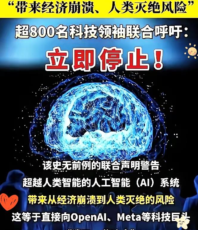 被这两天的新闻吓到了!你们知道吗?全球超过3000多位全球顶尖大佬联名喊停超级智能研发,这事儿真不是杞人忧天! 要知道签名的都是辛顿、沃兹尼亚克、姚期智这种级别的人物,他们造了AI,现在却集体预警,说这东西可能搞出经济崩溃甚至更糟的后果。 更讽刺的是,科学家急着踩刹车,Meta、OpenAI这些公司还在猛踩油门拼速度。 别觉得这离我们远,现在AI都能伪造视频骗钱了,真等超级智能来了,AI教父说的“操纵人类”可能就成真了。 最要命的是,现在连靠谱的管控方法都没有,说用AI监督AI,纯属自欺欺人。 这根本不是技术快慢的问题,是人类要不要给未来留条后路。 你觉得该硬叫停还是边发展边管控?评论区聊聊你的看法!