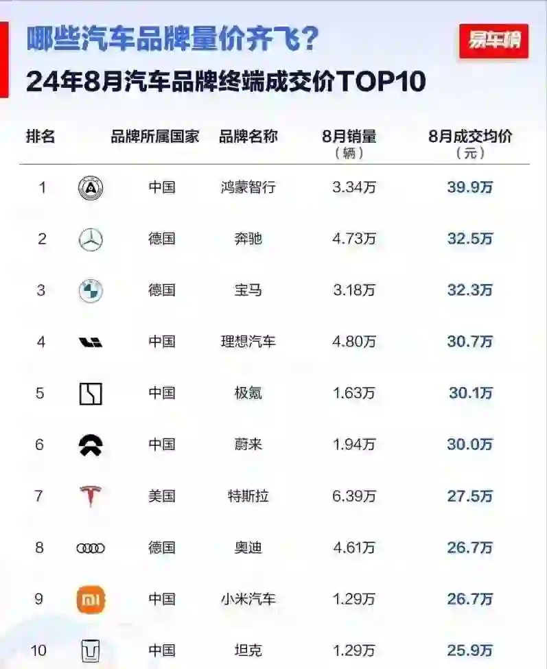 看看上个月的终端成交价,排名第一的是鸿蒙智行,成交均价达到了39.9万元,这是成交均价,可不是指导价,你再看传统豪华品牌BBA,奔驰是32.5万元,相比去年跌了6万元,宝马和奔驰接近是32.3万元,奥迪只有26.7万元,和小米汽车均价是一样的。