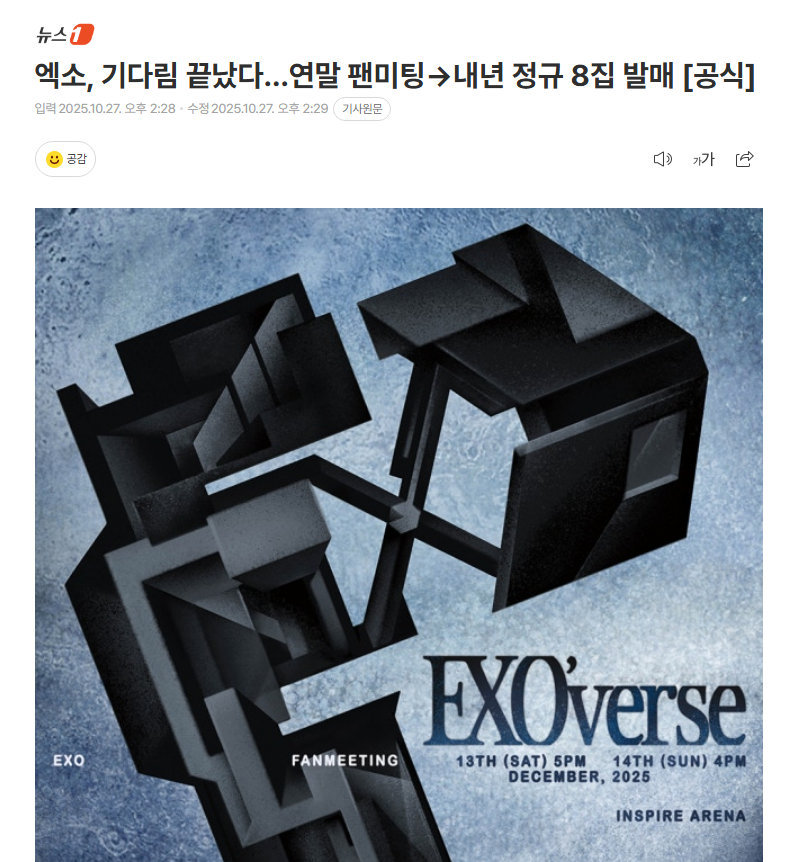 exo粉丝见面会将于12月举行exo将12月举办粉丝见面会 据韩媒,EXO将于12月13日至14日举行粉丝见面会《EXO'verse》,并在明年发行正规8辑。据悉,本次活动参与的成员包括金俊勉、朴灿烈、都暻秀、金钟仁、吴世勋及张艺兴。