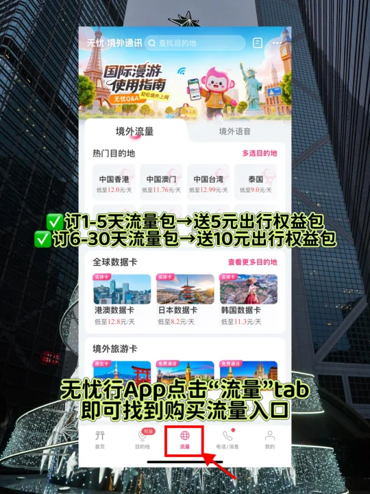 流量特惠:境外流量包由12.99元/天起,覆盖国庆、元旦等出行高峰