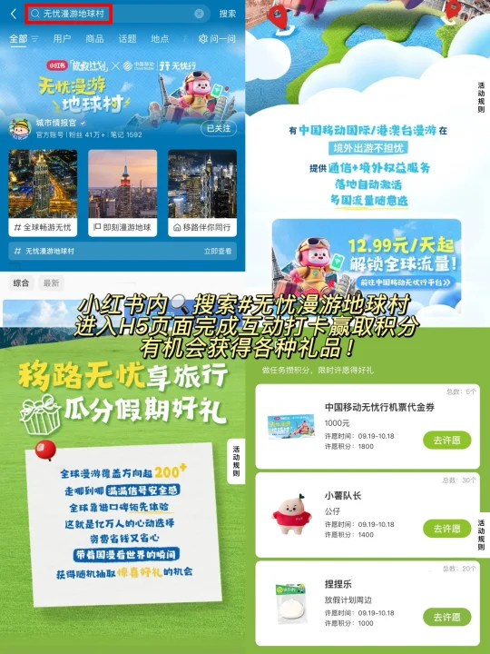 ✅10月18日前内搜索无忧漫游地球村 ,进入H5页面完成互动打卡赢取积分,有机会获得各种礼品