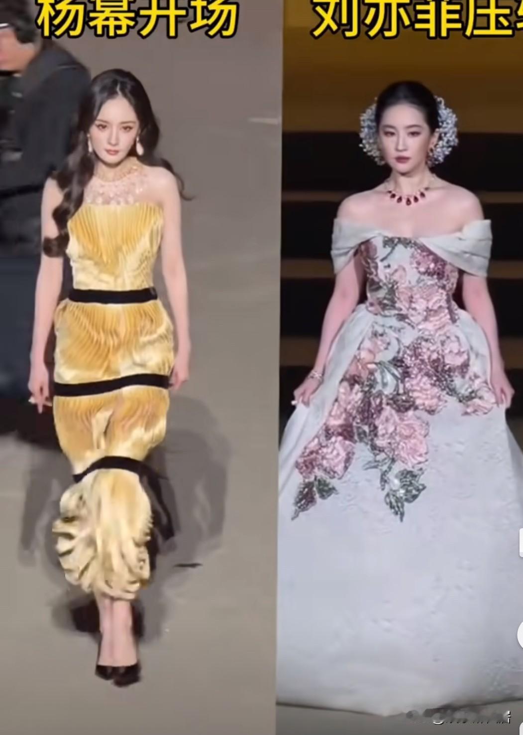 杨幂开场刘亦菲压轴! 本以为晚宴会坐在一起的两个人竟然离的那么远, 估计两个人也是“明争暗斗”吧? 毕竟都是85花, 两个资源也都很好, 还有网友说杨幂开场时穿黄裙子好像不开心, 我特意去看了下, 有点“挂脸”, 再看看刘亦菲, 这气质绝完胜, 其实两个人都非常美, 妆造不同, 气质不同, 你们更喜欢哪个呢?