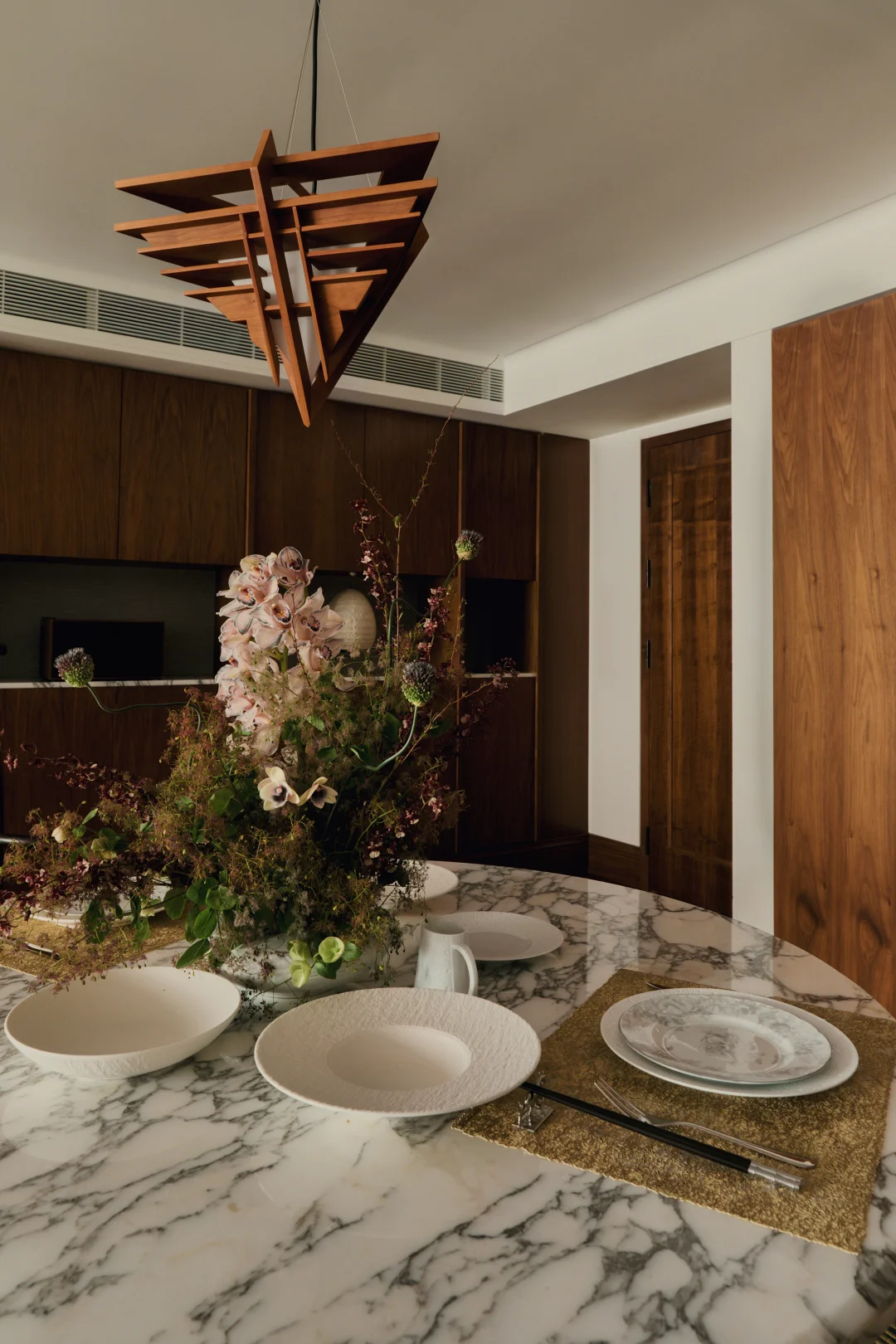 步入客厅,空间语汇转为开放与对称。法国家具雕塑与“红楼梦”八扇大漆款彩屏风形成视觉张力,一边是抽象的西方浪漫主义雕塑语言,一边是中国古典文学意象的具象化演绎。