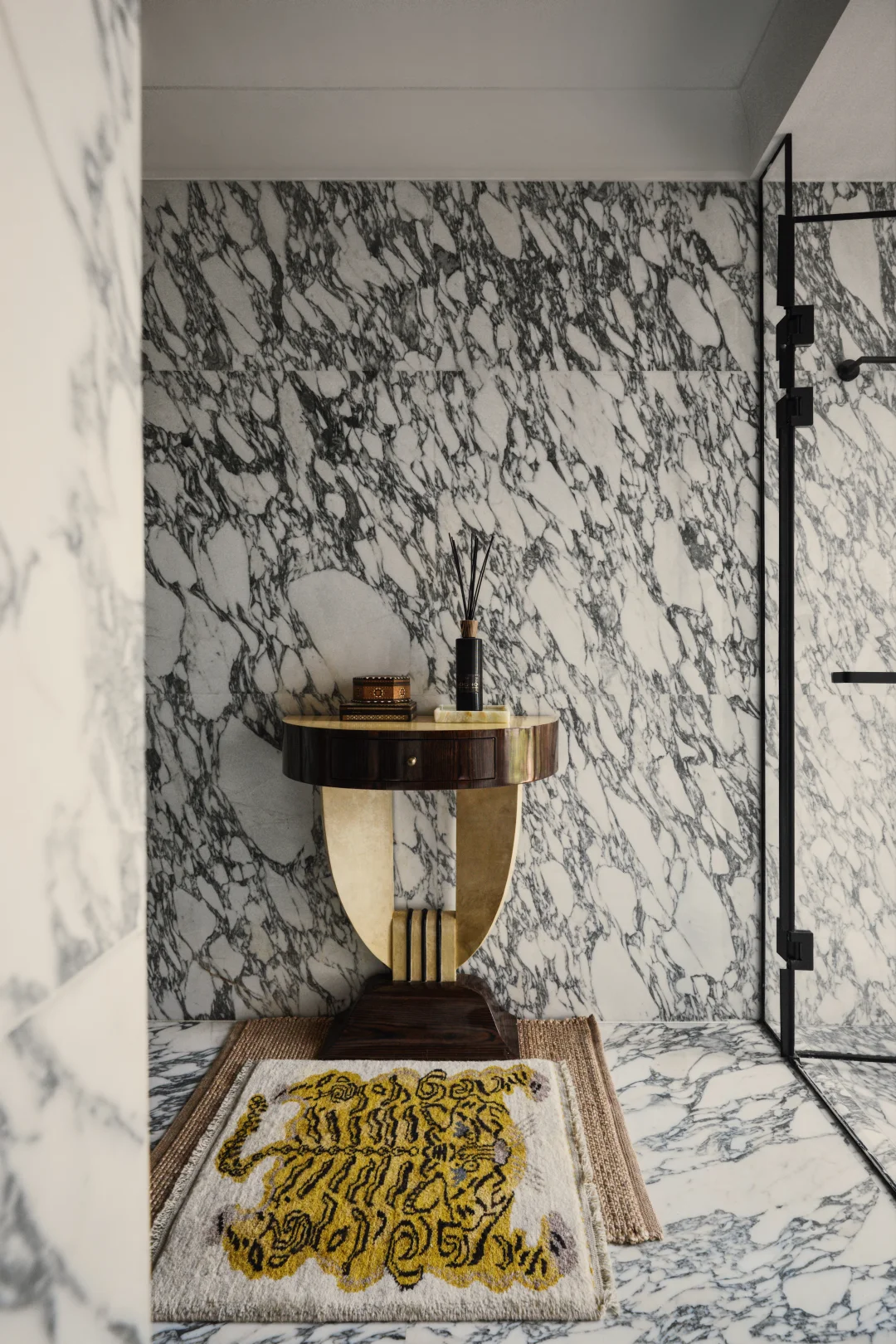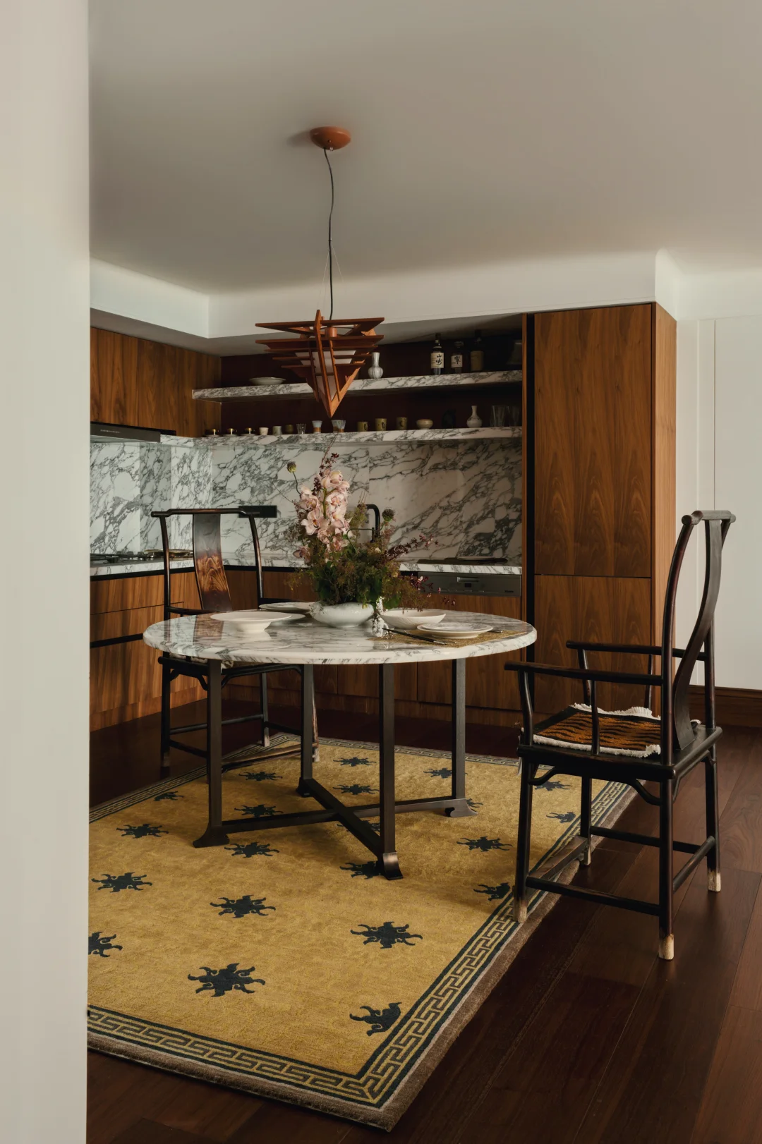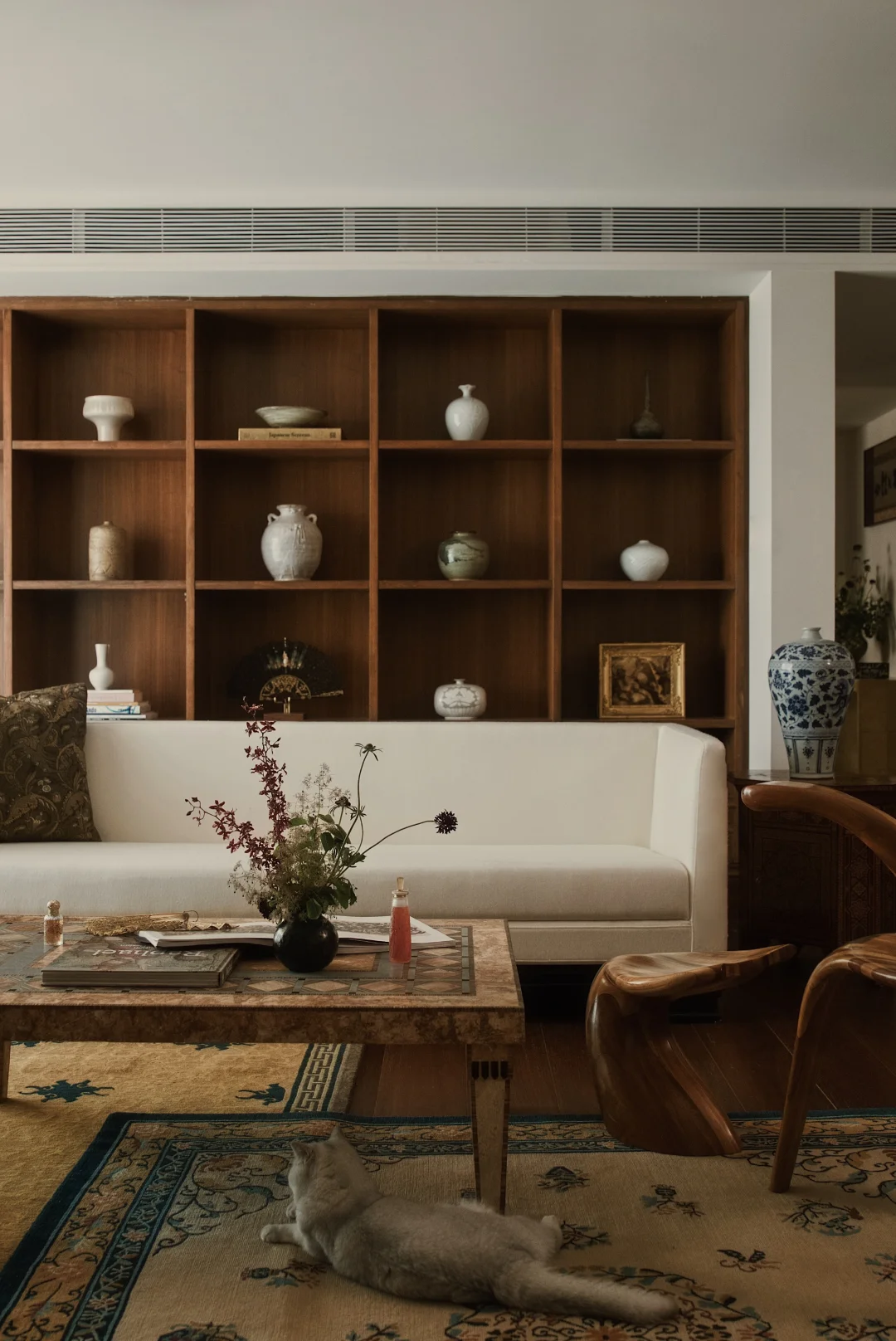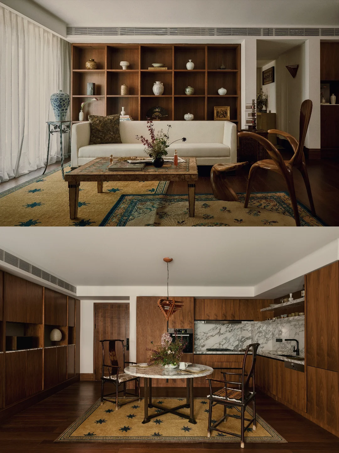 客厅中的几张高原藏毯,来自手工藏毯品牌CHANGPHEL山赴,“米黄地宝相花花卉纹”“雪狮与老虎”等传统图腾手织技艺与现代调性色彩构建出东方美学的当代表达。