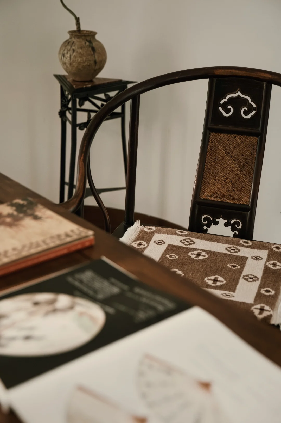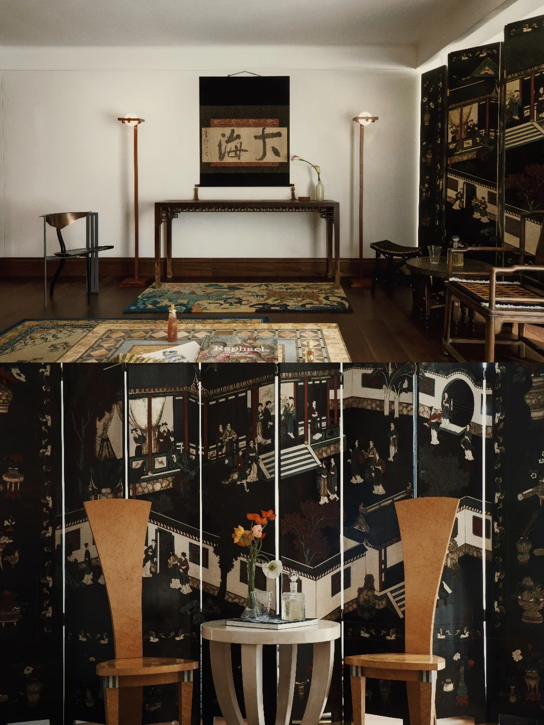 意大利Art Deco羊皮玄关桌与摩洛哥八角边桌、法国19世纪三角边桌、英国黄铜折叠茶几共同构建出多点式的使用结构,与中式帽椅、古寺院法书装池等古物形成时间维度上的交叉叙事。