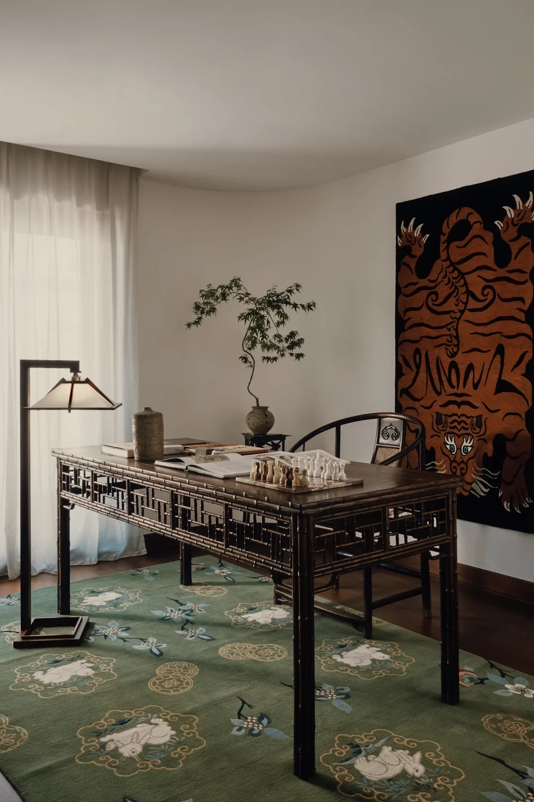 书房延续中西融合主线。 地面以“玉兔月桂”图腾藏毯加持寓意与节令,墙面以“虎跃”增添整体氛围感,一动一静,使书写阅读之地多了一份仪式感与趣味性。