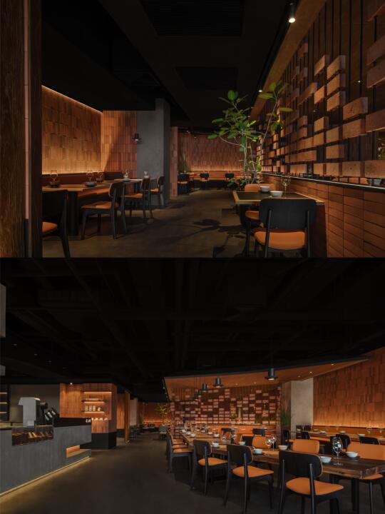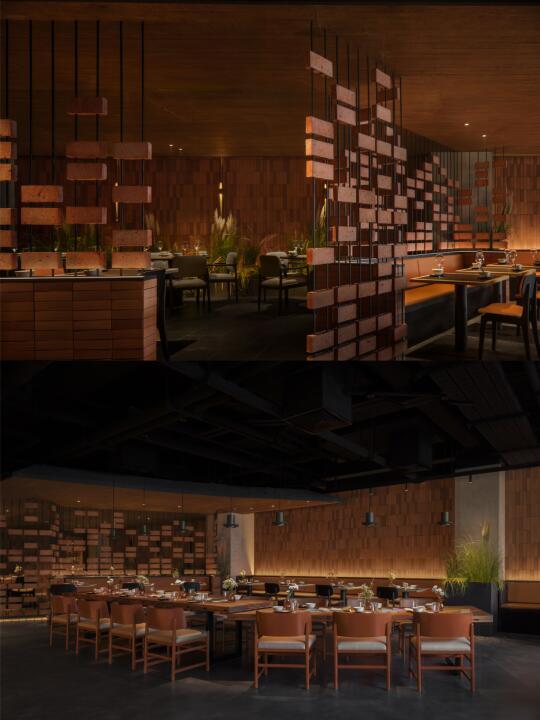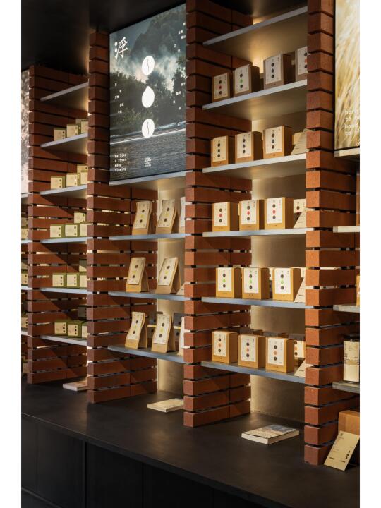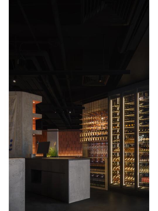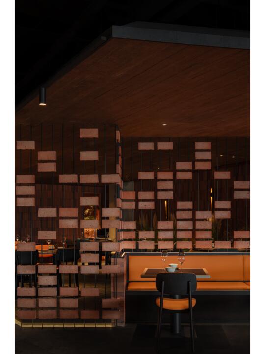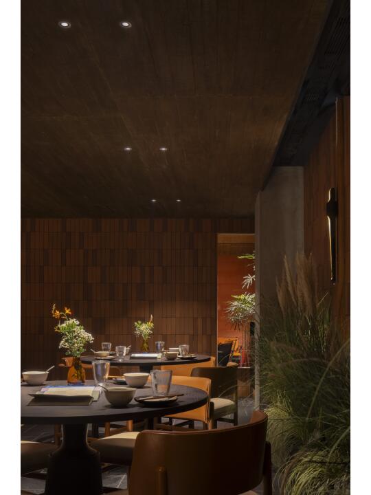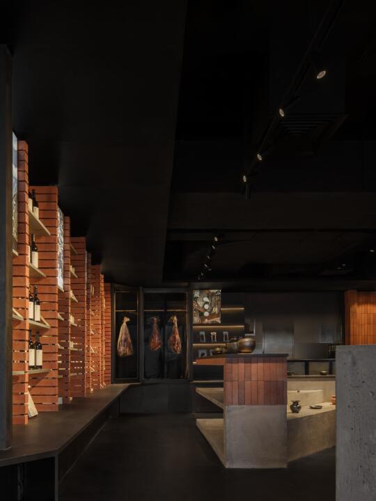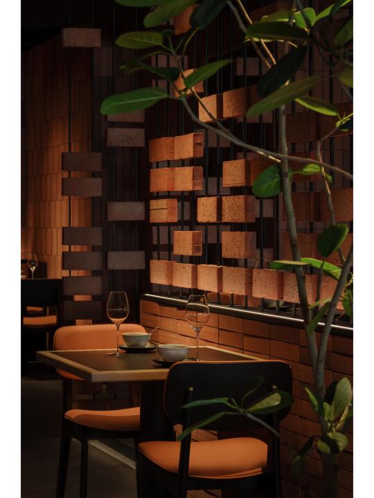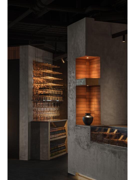 在餐区以红砖为主混凝土为辅,在风物区以混凝土为主红砖为辅,回应主题半生不熟,即材料和食材一样,都需要在地加工完成,隐喻一个来到大城市生活的云南人的状态。再基于不同的空间属性,在局部和软装上结合不同的原始自然材料和绿植。