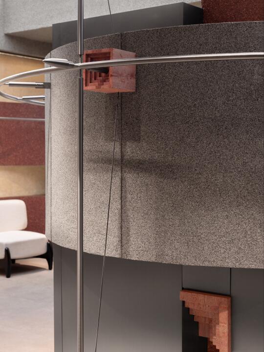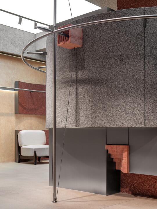 红洞石的温润肌理与金属构件的冷峻碰撞,构建出强烈的感官对比。