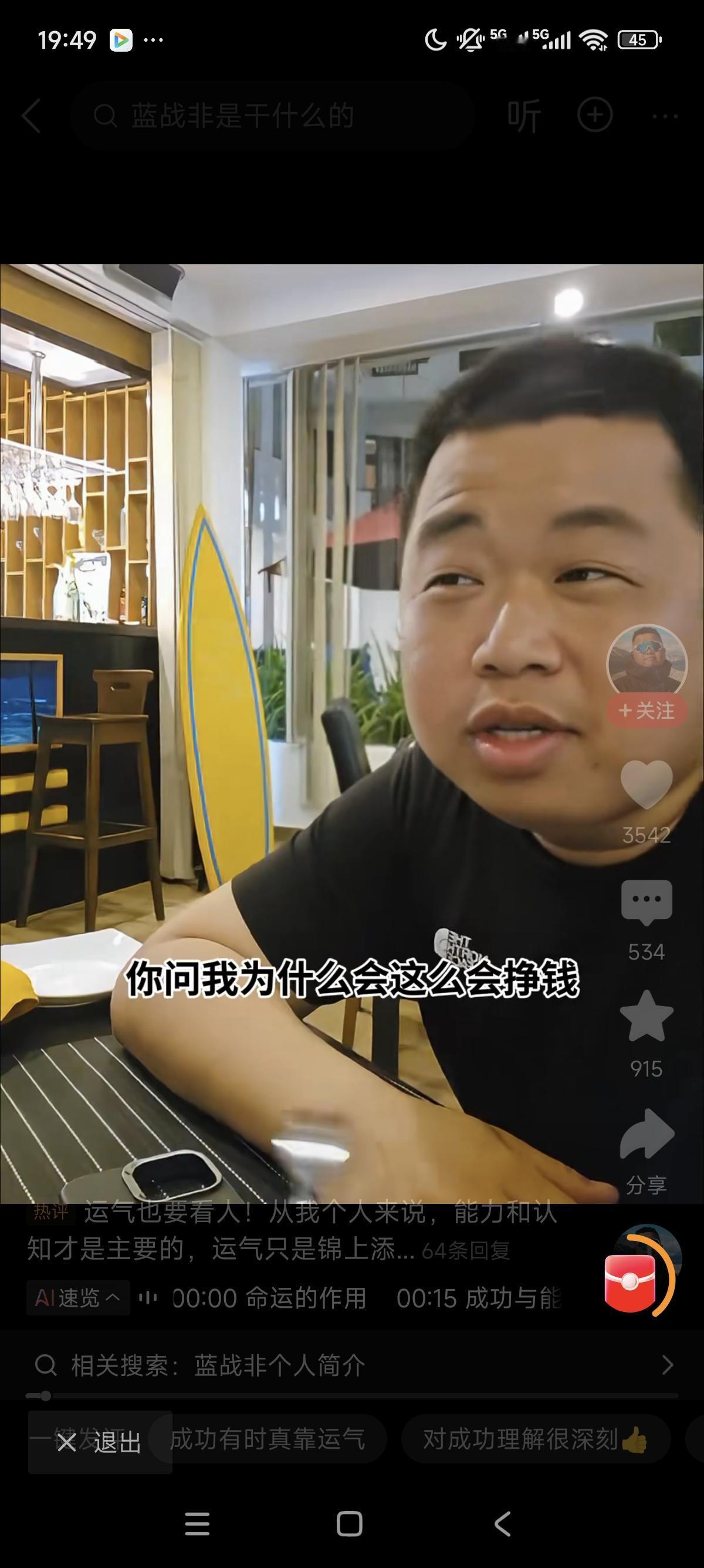 蓝胖子最近又语出惊人! 网友问他有没有什么成功秘诀? 他说成功的秘诀就是运气好,并告诉网友不要相信,成功人士给他们灌的鸡汤。 因为那些人成功了,所以他说什么都是对的,其实成功的人99.9%靠的都是运气,只要运气来了,你挡都挡不住。 就跟鸡排哥一样,最后他也补充道,虽然靠的是绝对的运气,但是还是要靠0.001%的努力如果你连这一丁点准备都没有,运气到了你面前你都把握不住! 大家觉得他说这话对吗?