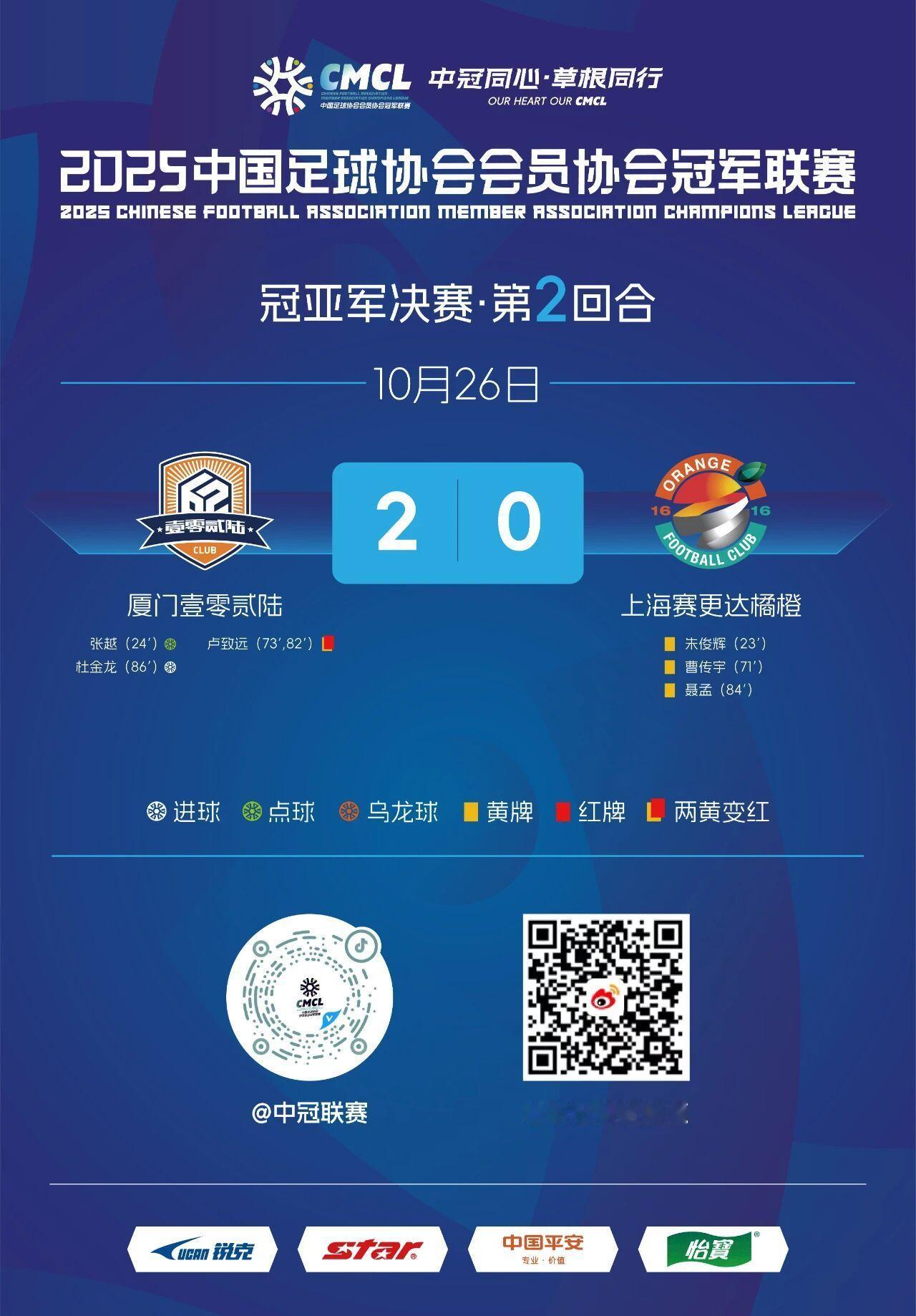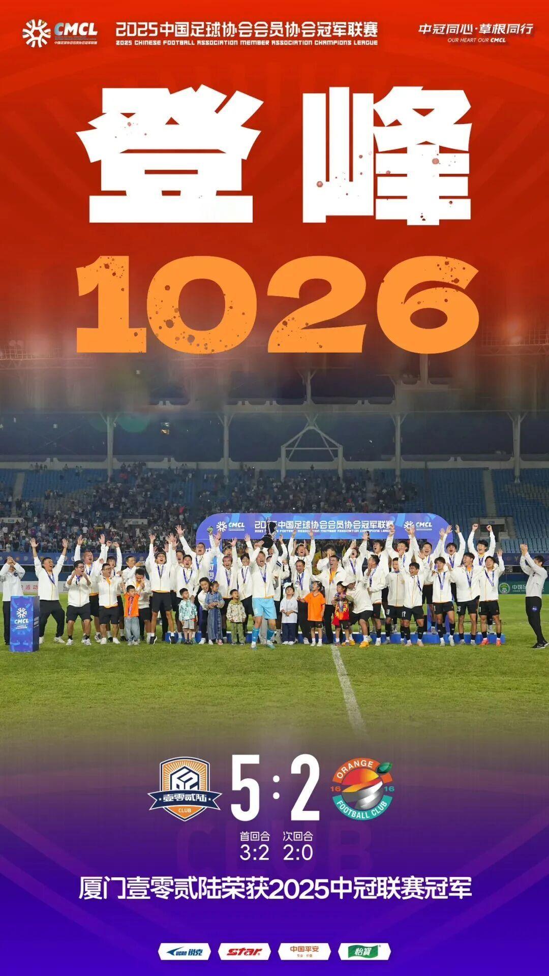 10月26日19:00,中冠联赛总决赛冠亚军决赛次回合厦门壹零贰陆与上海赛更达橘橙的比赛在厦门市体育中心体育场进行,厦门壹零贰陆2-0上海赛更达橘橙,两回合总比分5-2,厦门壹零贰陆夺得2025赛季中冠联赛冠军,上海赛更达橘橙则为亚军。