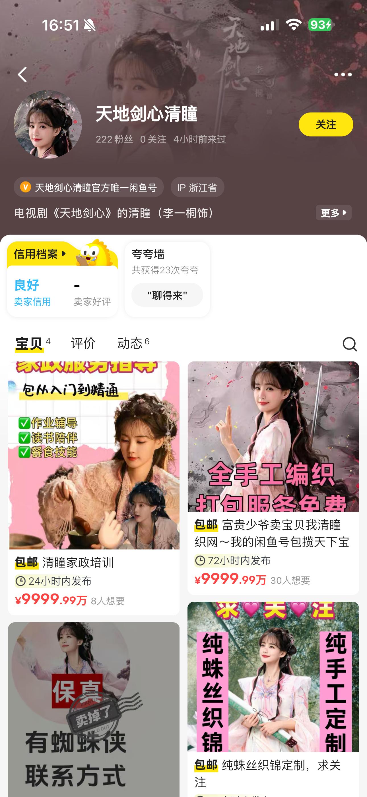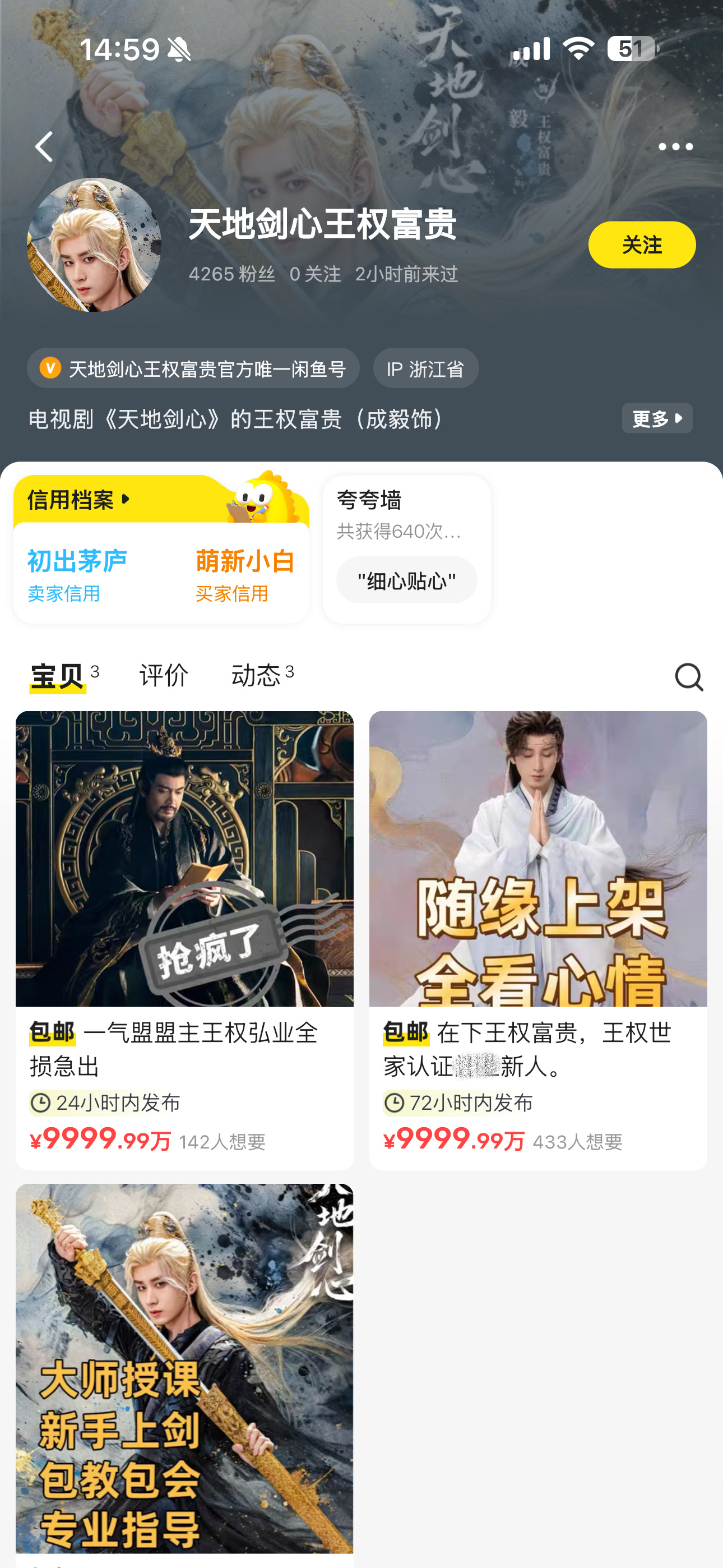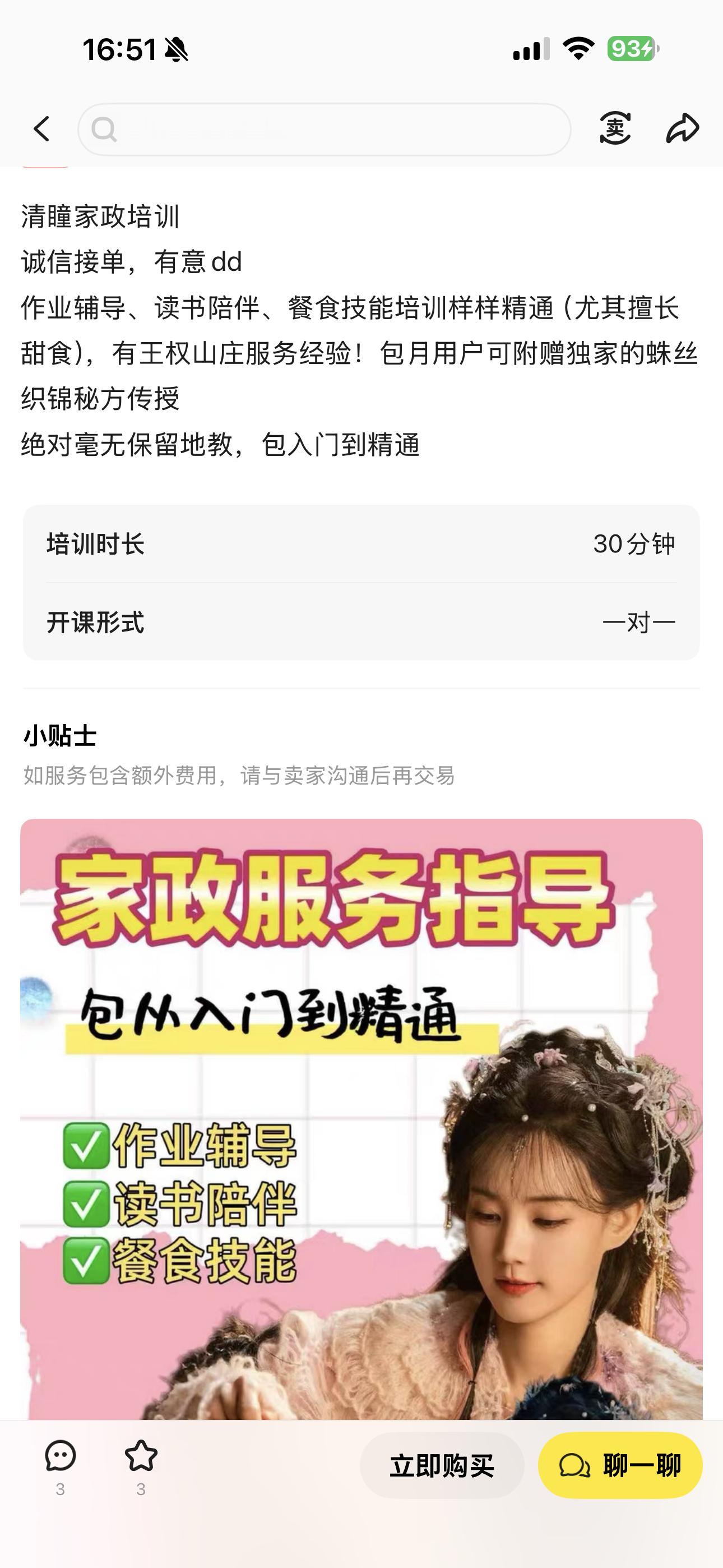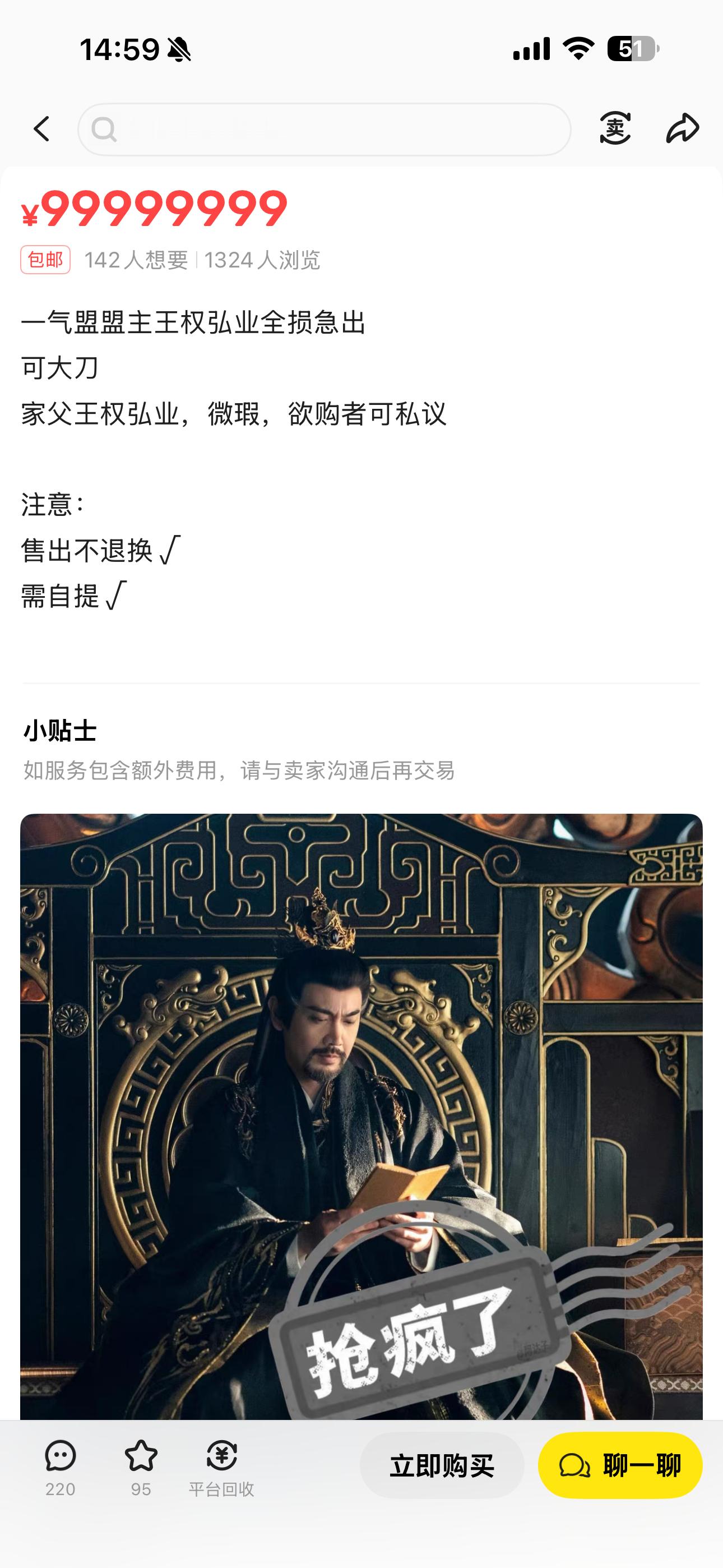 富贵少爷把亲爹挂了 剧中王权富贵被父亲囚禁在寒潭练功不让外出,少爷反手就把爹挂上网“卖掉了”,hhh王权富贵你真的孝死我了。而且听说马上就要上演万剑穿心名场面,快把王权弘业卖掉吧,不然刀的就是我们这些观众的心!而且我在闲鱼搜了王权富贵,青瞳,是真的有闲鱼号~青瞳今天还挂出了家政培训hhhh。小黄鱼,你这波剧宣堪比番外呀。