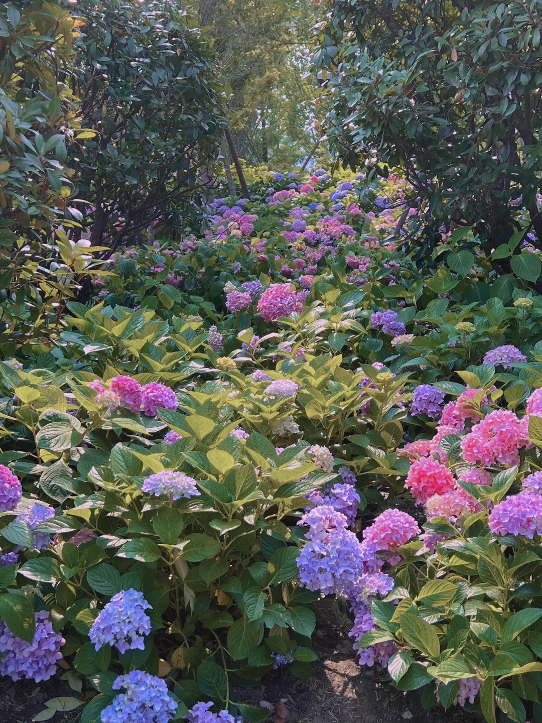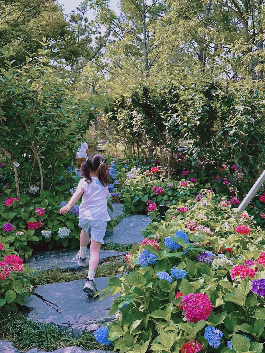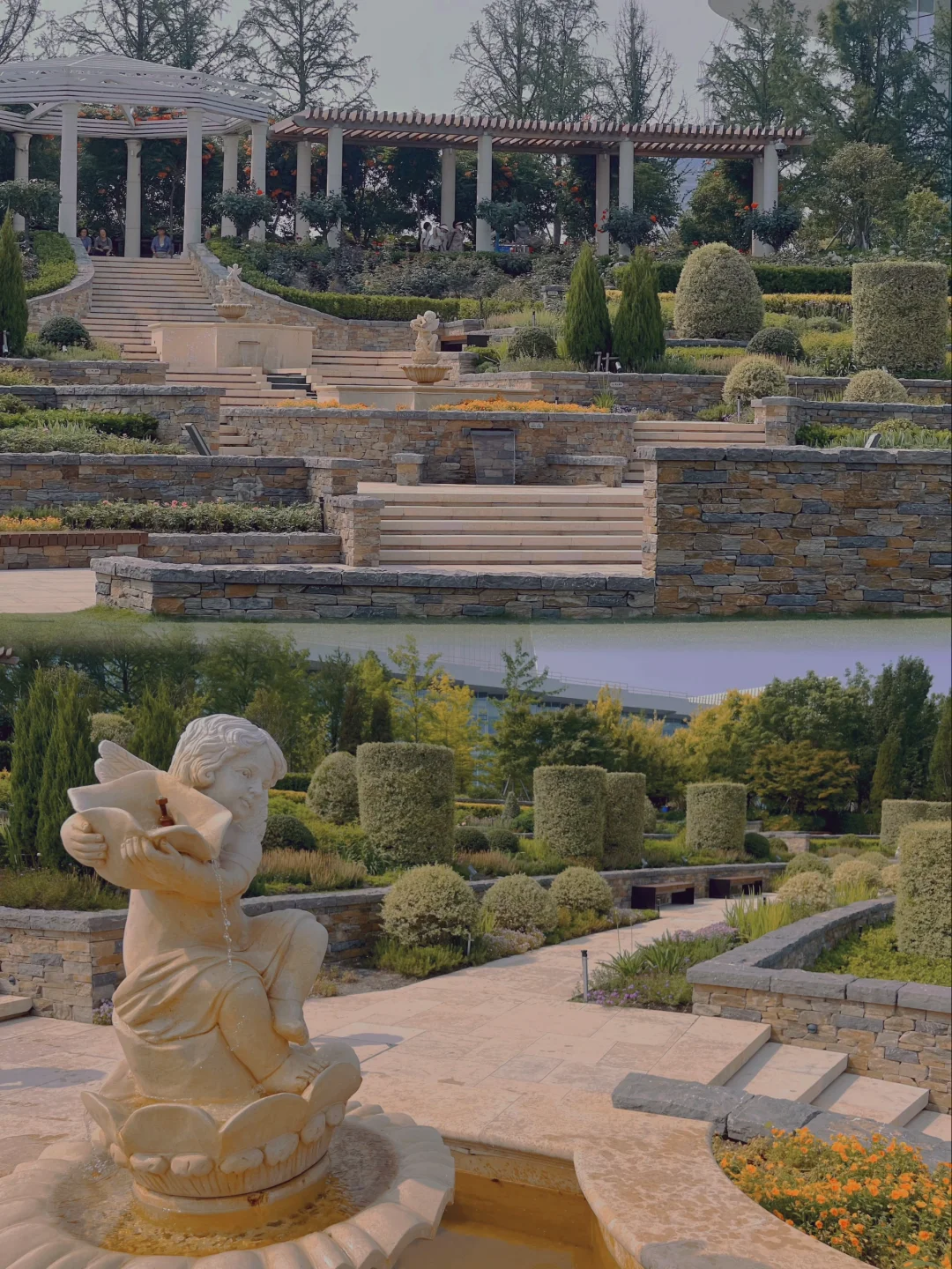 以法式的花坛与喷泉为景观,搭配零星的花卉点缀,非常浪漫。有好几处喷泉⛲️,不仅出片📷也很适合玩水。拱门外小山坡上开满五彩绣球,美轮美奂